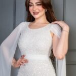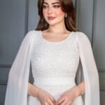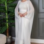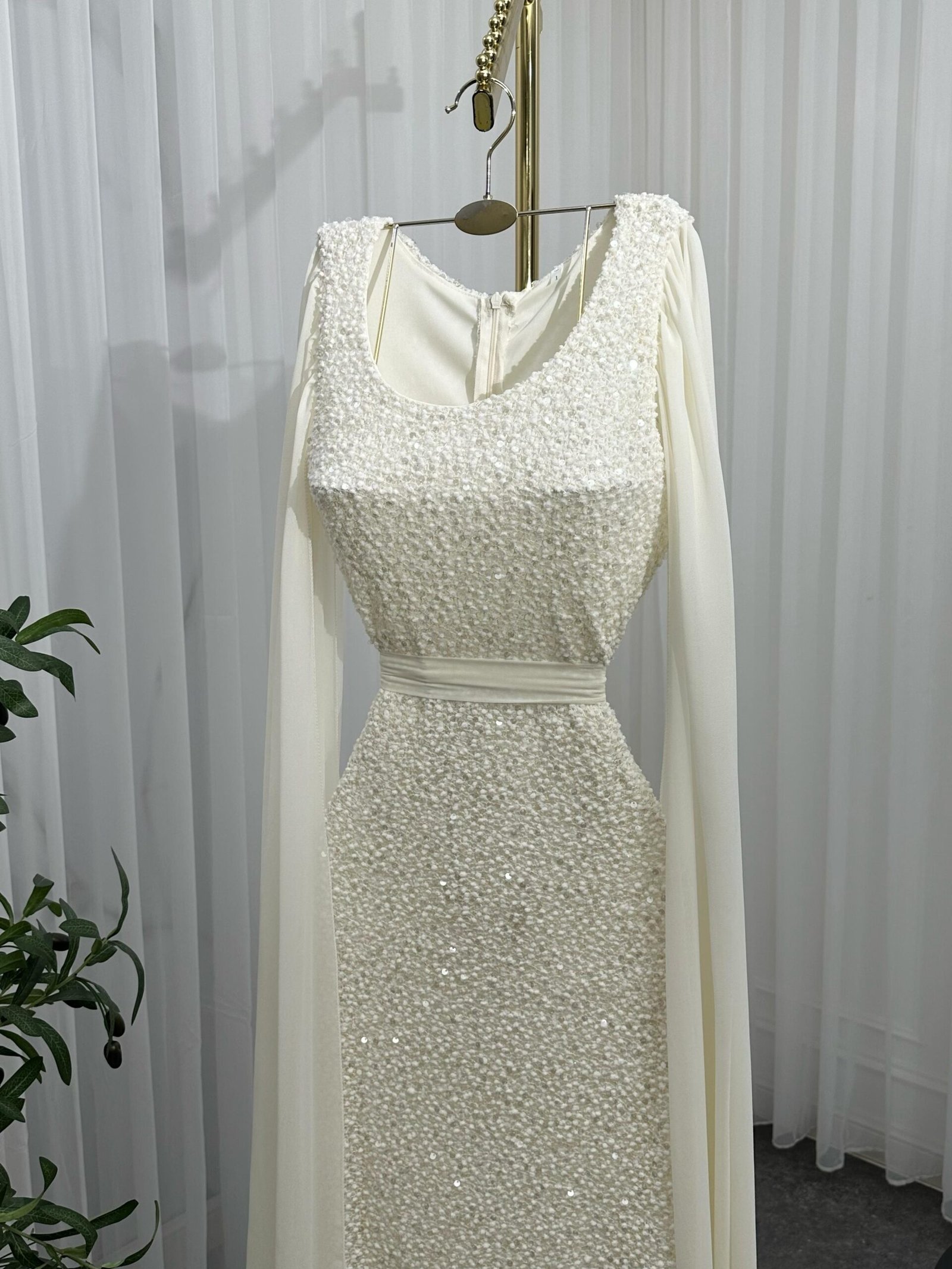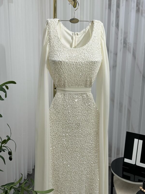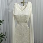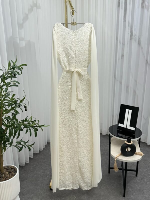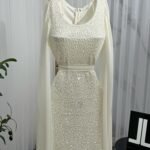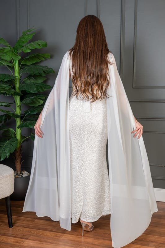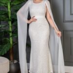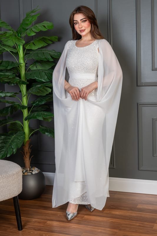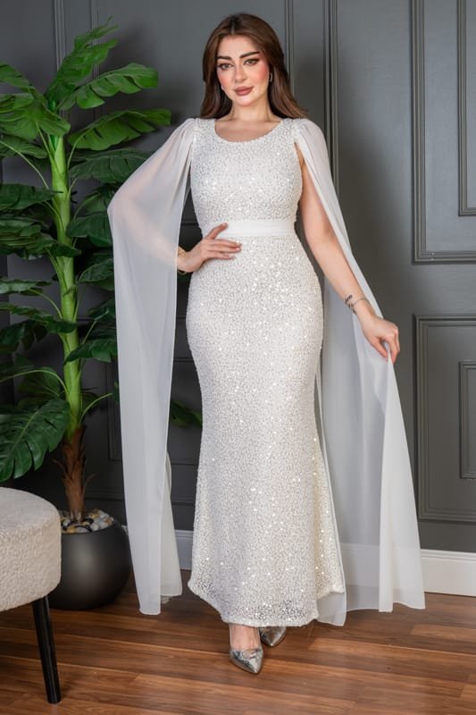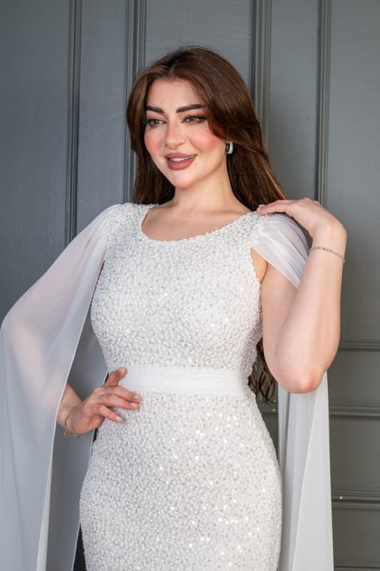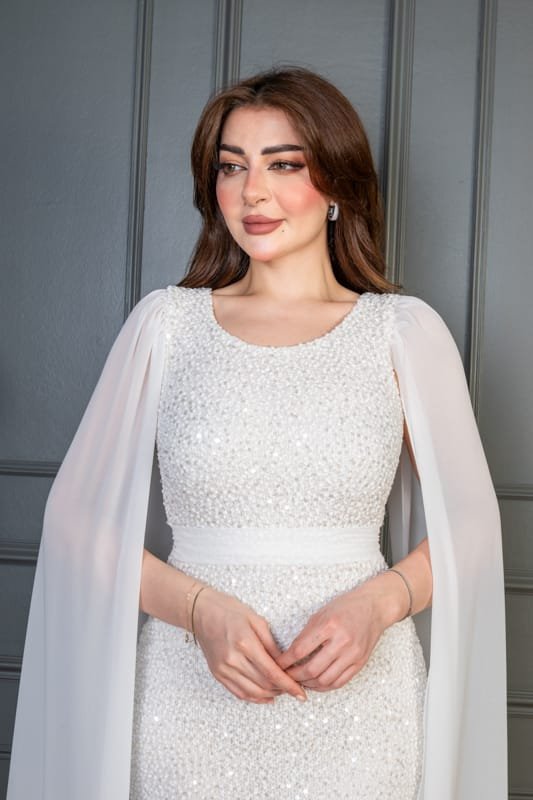 فستان سهرة طويل يأتي بقماش ترتر فاخر مبطن بالكامل، يعكس الإضاءة بإشراقة لافتة تناسب أجواء المناسبات الراقية. يتميّز بقصة ضيّقة تبرز جمال القوام، مع كاب شيفون طويل ينسدل من الأكتاف ليمنحك إطلالة فخمة مستوحاة من الأناقة الملكية. حزام عند الخصر يضيف تحديدًا ناعمًا يكمّل شكل الفستان بطريقة متقنة.