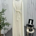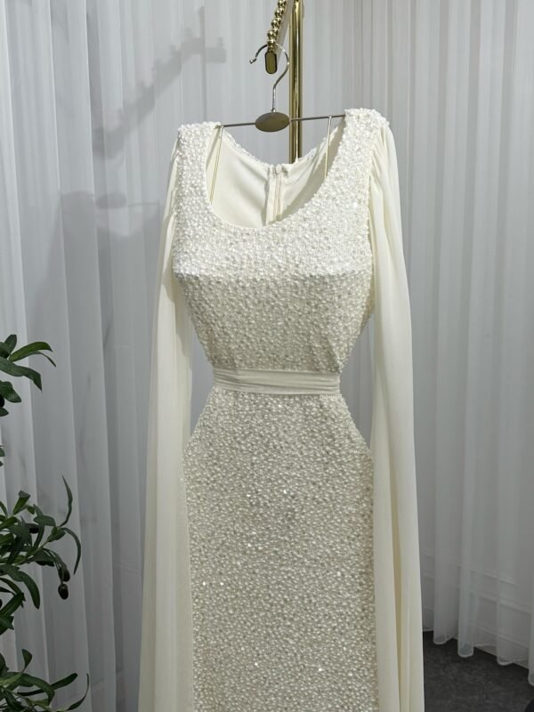 فستان سهرة ناعم طويل بلون أوف وايت ترتر، مثالي للمناسبات الرسمية، حفلات الأعراس، حفلات التخرج، ليالي العيد، وسهرات الشتاء الراقية. مناسب للذوق الخليجي ولمحبّات التصاميم البسيطة الفخمة.