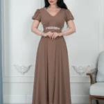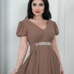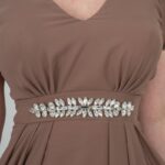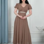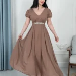 🔹 القصة: صدر V، خصر محدد بحزام مطرّز، وتنورة كلوش طويلة