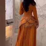 ✨ فستان فاخر مستوحى من ألوان الغروب الذهبية، ينساب بانسيابية كأمواج المساء الدافئة، ويحيطكِ بتوهج ناعم يخطف الأنظار.