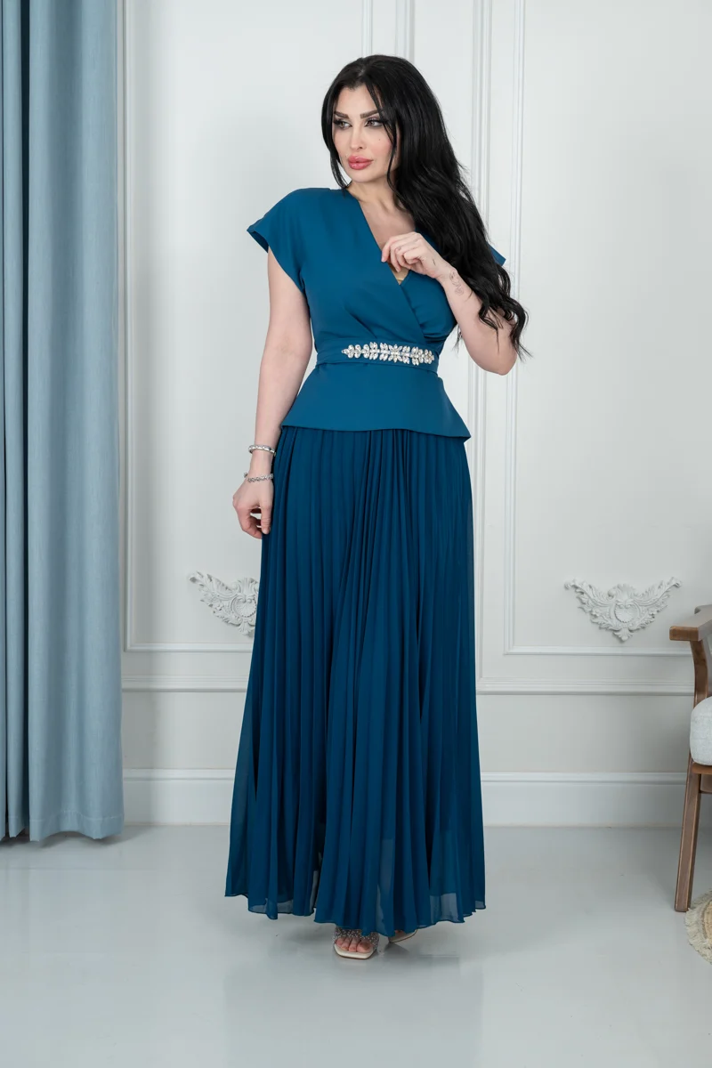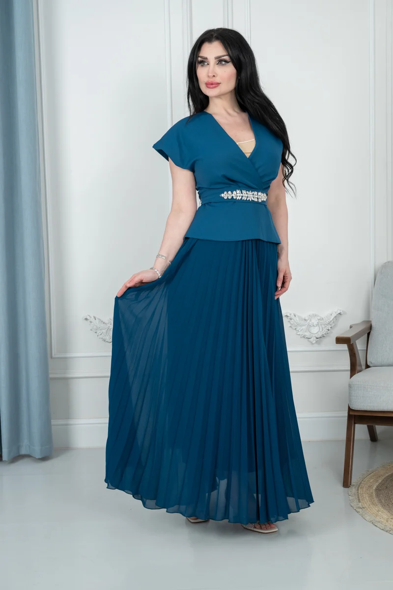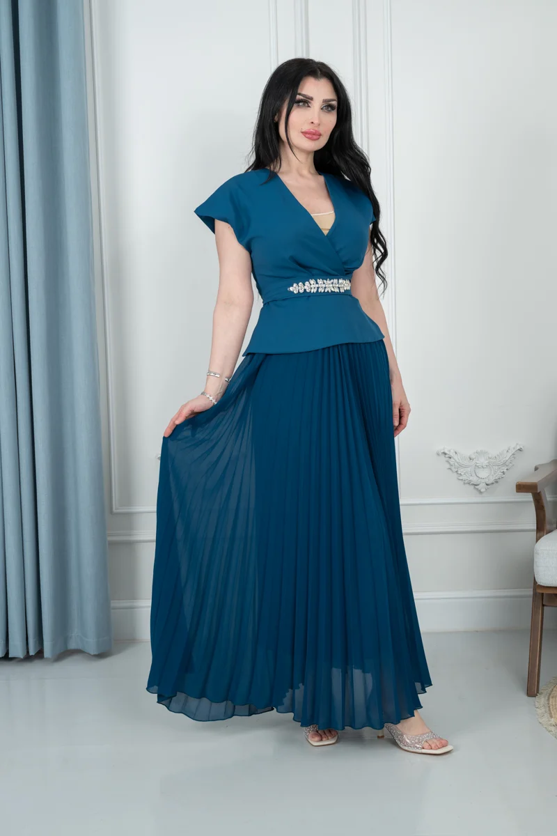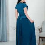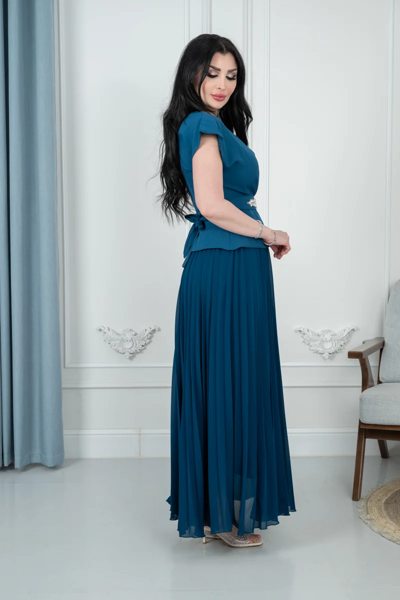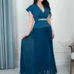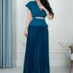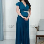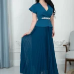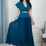 الخصر محدد بحزام لامع مشعّ يضفي بريقًا فخمًا ويعزز من جمال التصميم، بينما تأتي التنورة الطويلة بطول 154 سم بتصميم كلوش شفاف فوق بطانة داخلية، ما يمنح الفستان حركة خفيفة ولمسة ملكية جذابة. اللون الأزرق العميق يضفي صفاءً وأناقة مثالية للمناسبات الراقية.