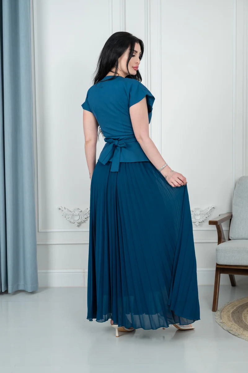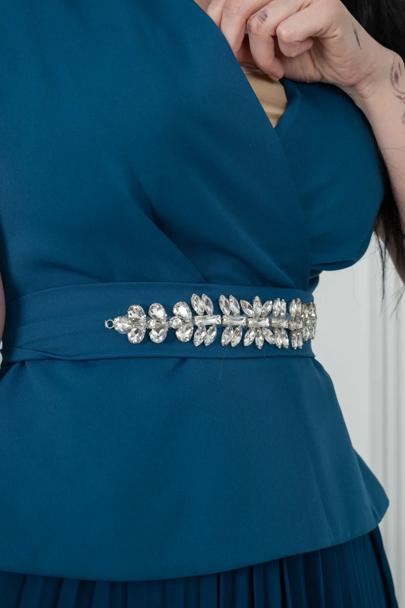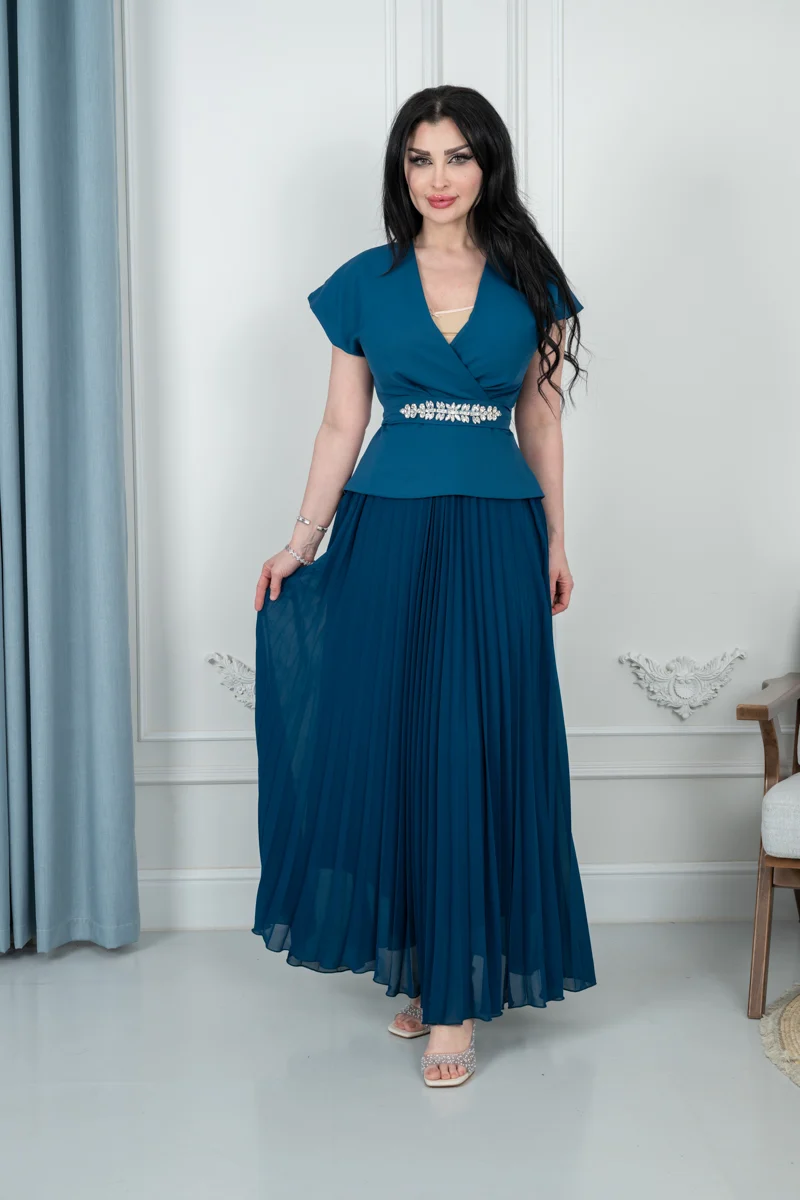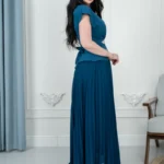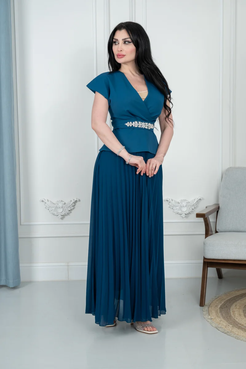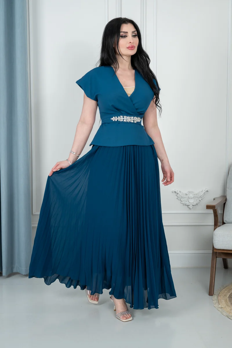 الخصر محدد بحزام لامع مشعّ يضفي بريقًا فخمًا ويعزز من جمال التصميم، بينما تأتي التنورة الطويلة بطول 154 سم بتصميم كلوش شفاف فوق بطانة داخلية، ما يمنح الفستان حركة خفيفة ولمسة ملكية جذابة. اللون الأزرق العميق يضفي صفاءً وأناقة مثالية للمناسبات الراقية.