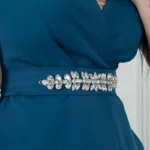 🔹 القصة: صدر V، خصر محدد بحزام لامع، وتنورة كلوش طويلة