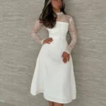 فستان الوردة البيضاء بقماش كريب وأكمام دانتيل قصيرة
