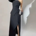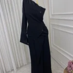 فستان جذاب مصنوع من قماش الباربي الفاخر بملمسه الناعم وهيكله المتماسك، يتميز بتصميم غير متماثل بكتف مكشوف وأكمام طويلة من جانب واحد، مما يضفي طابعًا عصريًا وجريئًا. تزينه أزرار مائلة تبدأ من الكتف حتى الخصر، بينما تأتي التنورة بطبقة أمامية قصيرة وأطوال متفاوتة تمنح الحركة تألقًا وانسيابية. تصميم مثالي للسهرات العصرية والمناسبات ذات الطابع الفاخر.