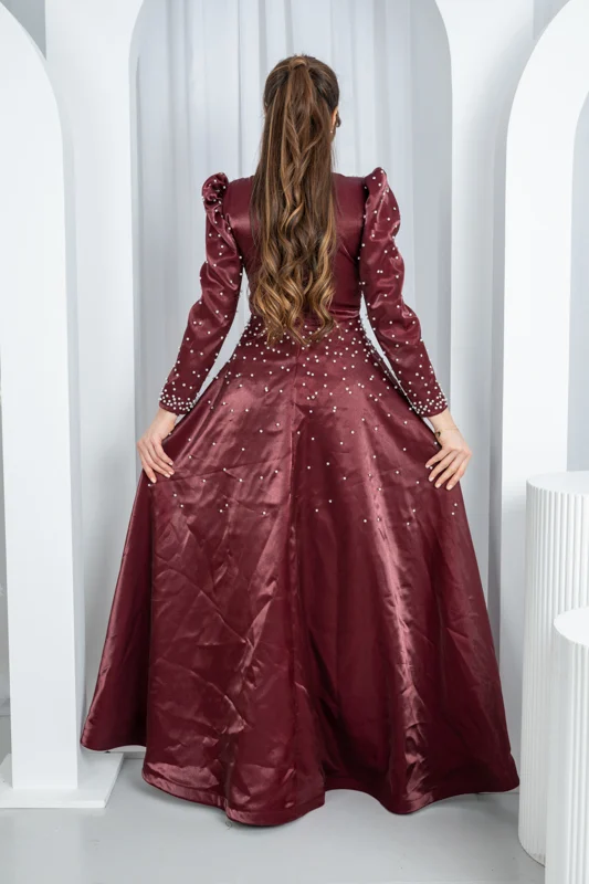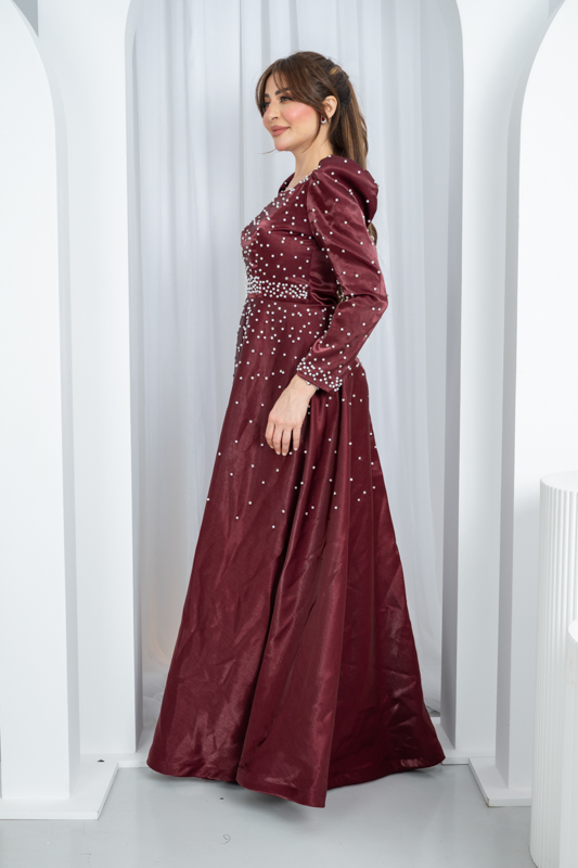 💎 فصوص اللؤلؤ المتناثرة على الصدر والأكمام تضفي لمسة ملكية آسرة، كأنها نجوم متلألئة على قماش القمر.