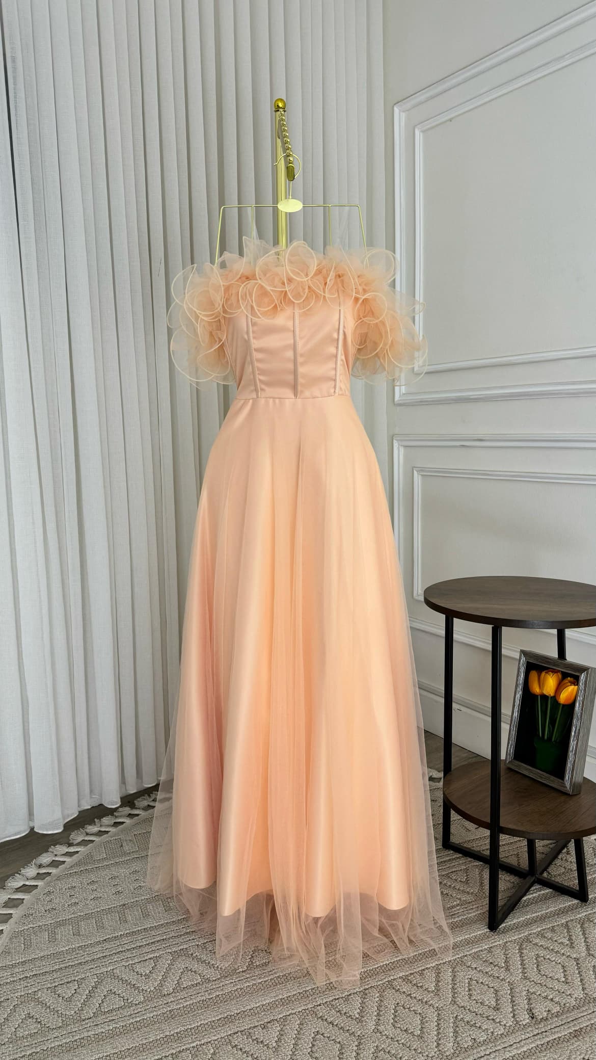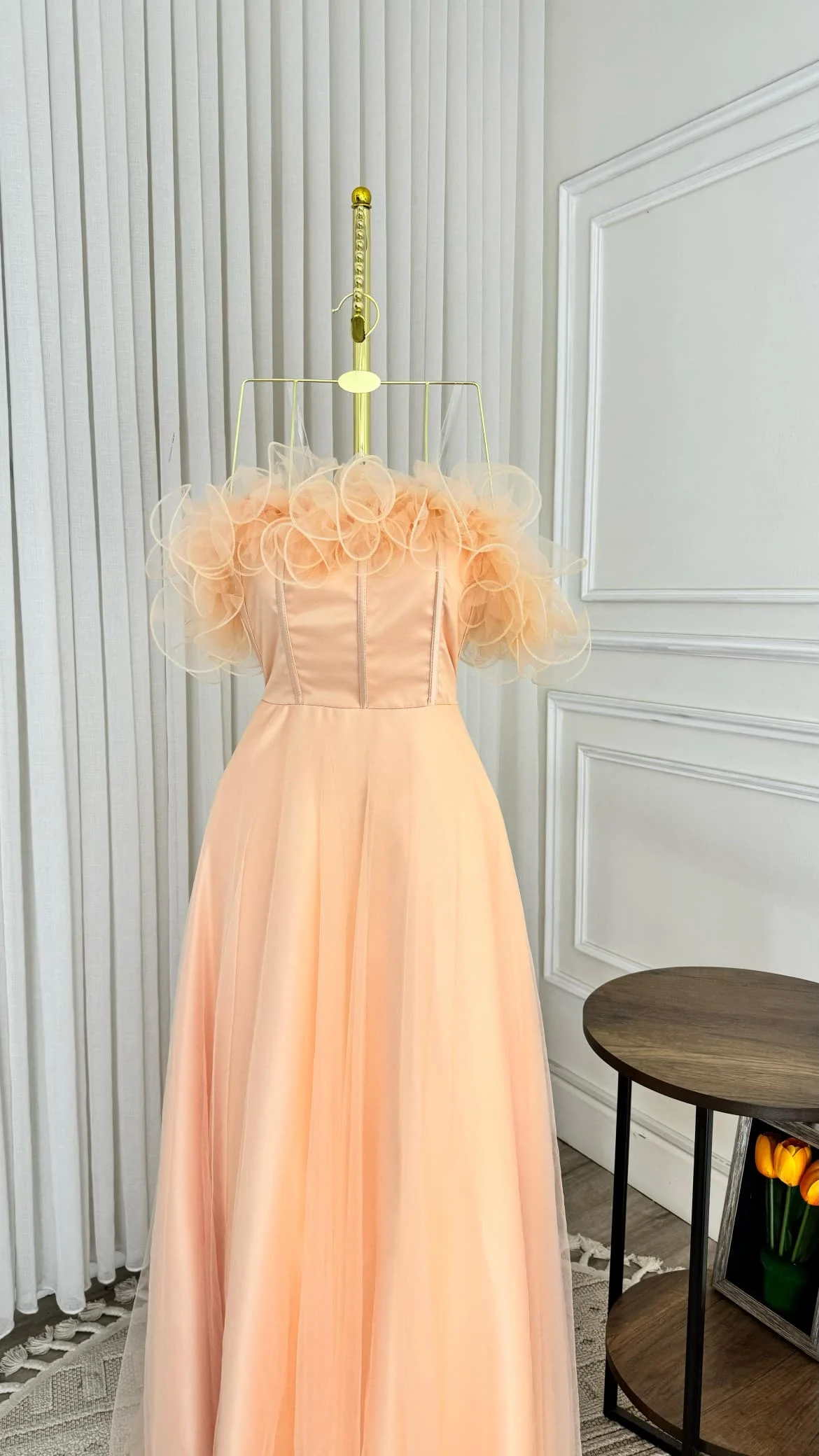 ✨ فستان ساحر بتفاصيله الراقية، يتميز بتشكيلات أنيقة من التل الناعم الرقيق في الجزء العلوي، تضفي أنوثة حالمة وجاذبية فريدة.