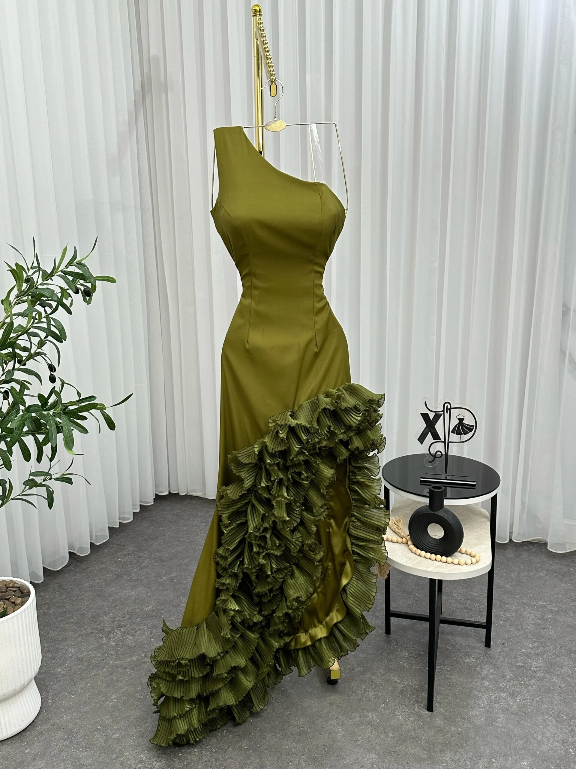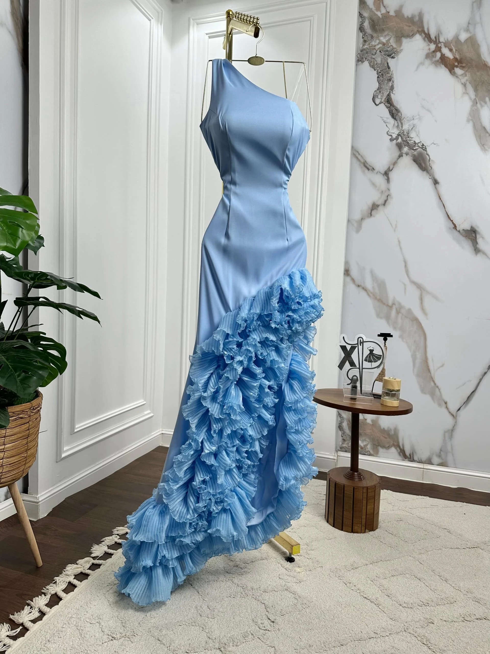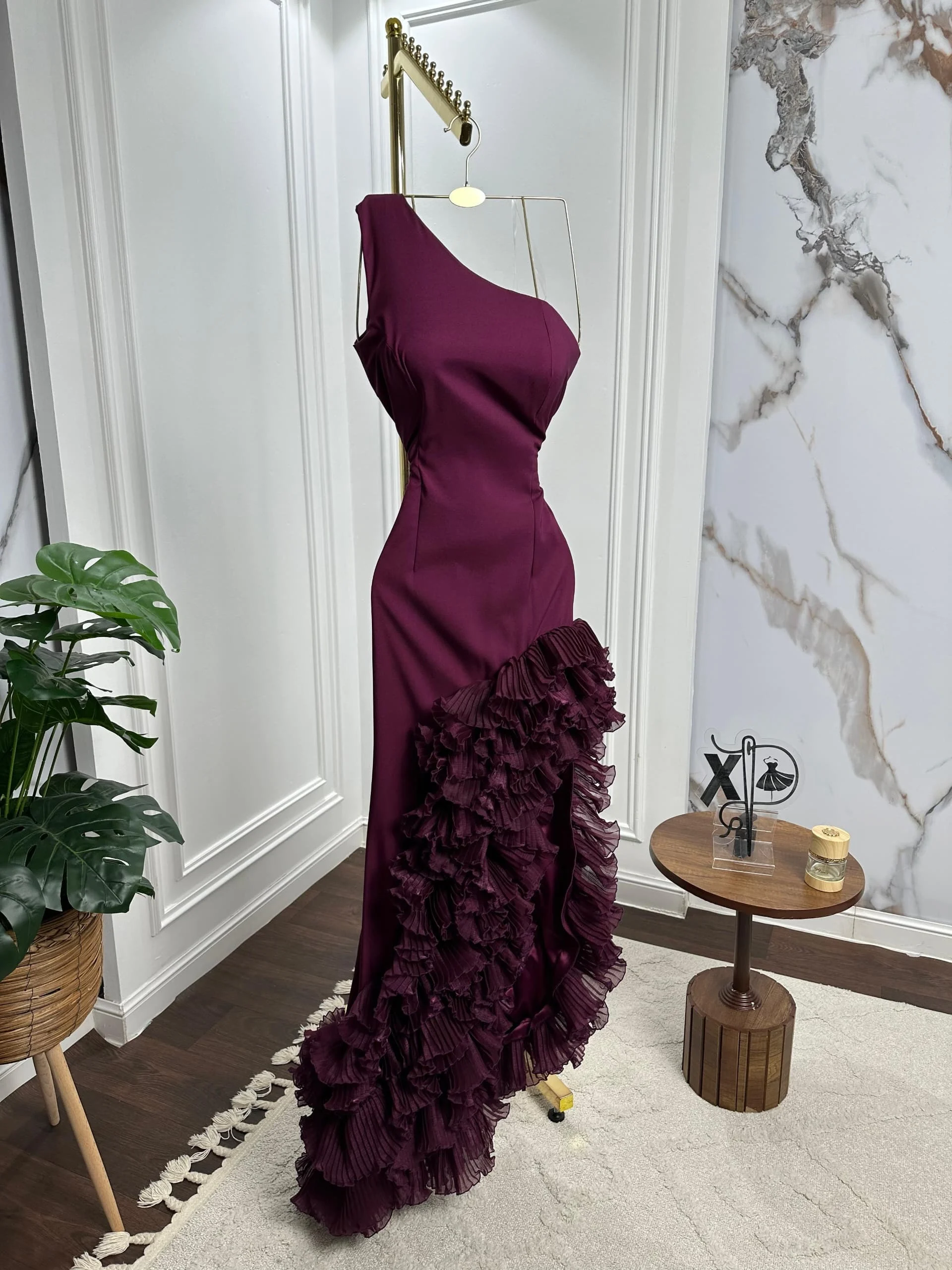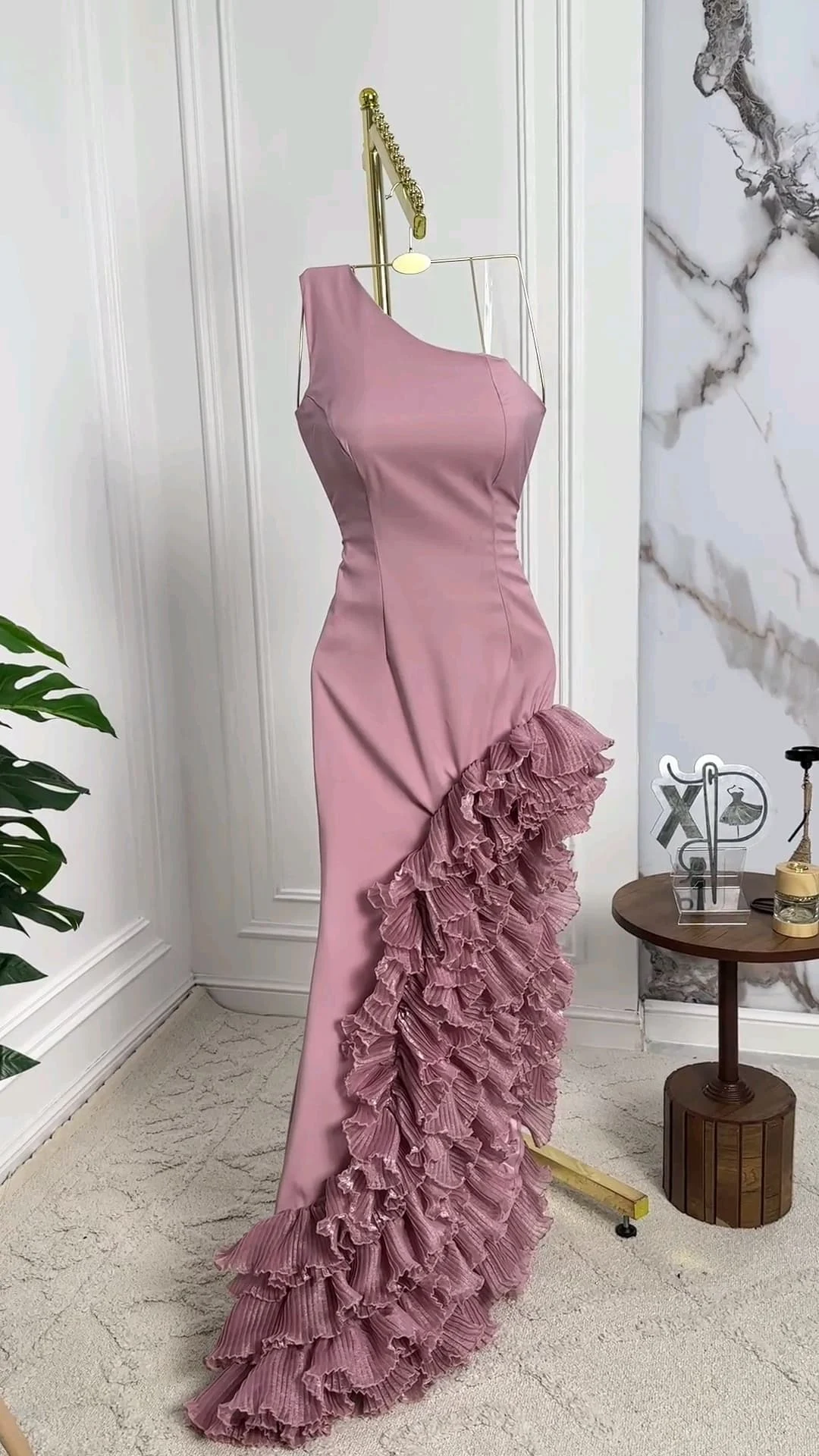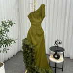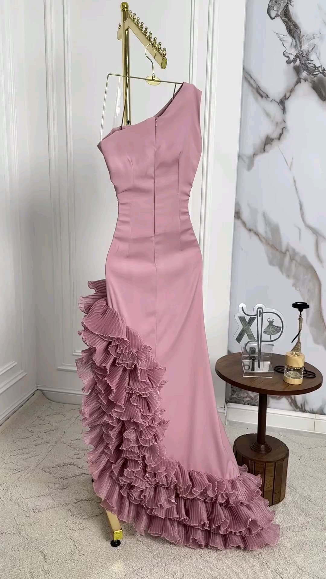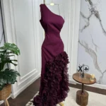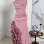 ✨ فستان تموجات السحر يتميز بتصميم كتف واحد أنيق مع كشكشة متموجة تنساب بانسيابية رائعة على التنورة.