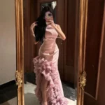 🌸 شعر مموج طبيعي: إذا كنتِ تفضلين تسريحة أكثر انسيابية، الشعر المموج مع فرق جانبي سيكمل جمالية الفستان ويضيف لمسة رومانسية.