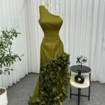 ✨ شعر مرفوع بأناقة: الكعكة المرتفعة أو المنخفضة تضيف لمسة راقية وتبرز تصميم الكتف الواحد، ويمكن إضافة إكسسوار بسيط مثل دبوس مرصع بالكريستال لمزيد من السحر.