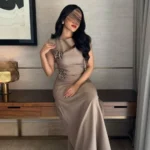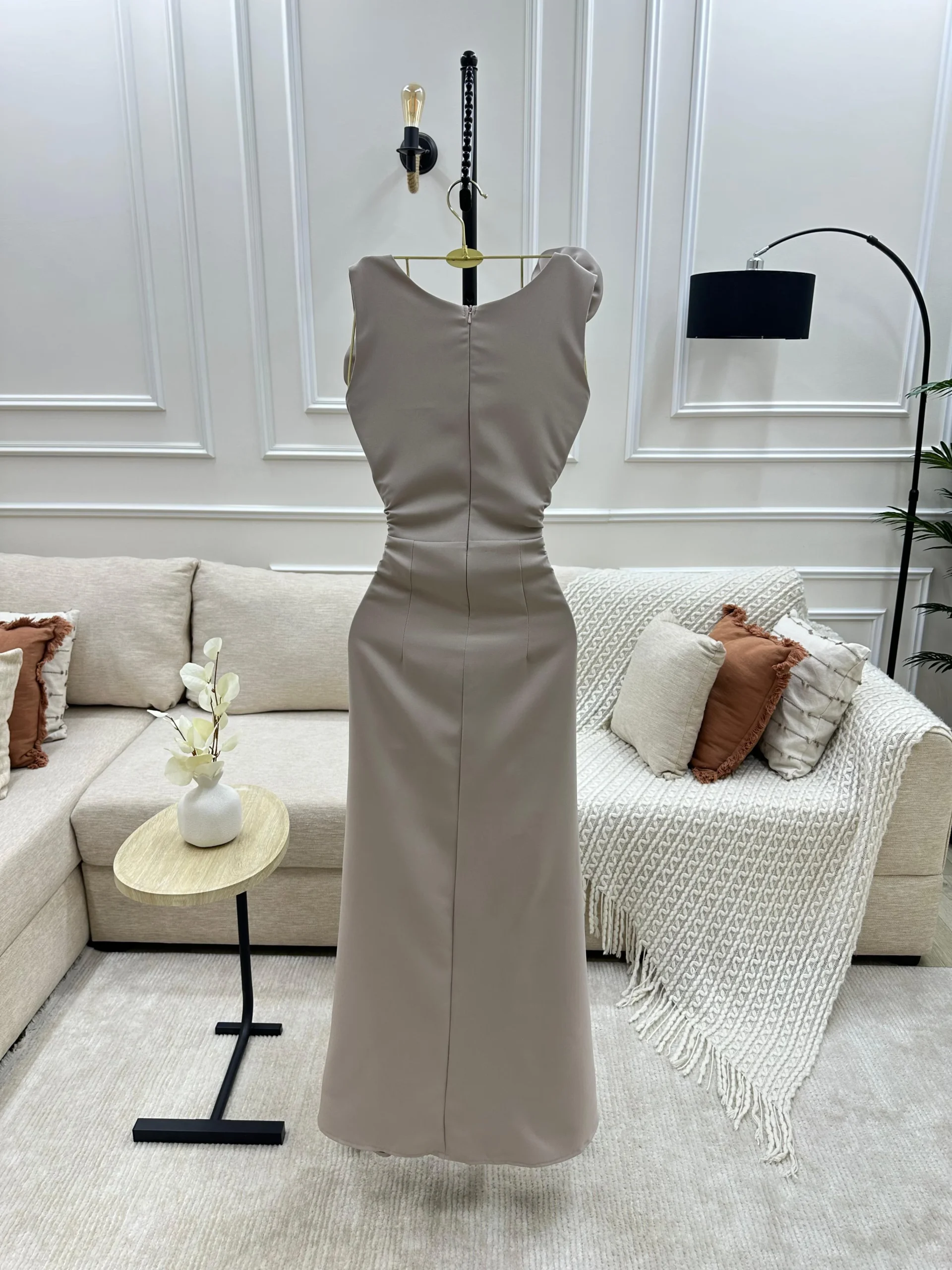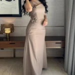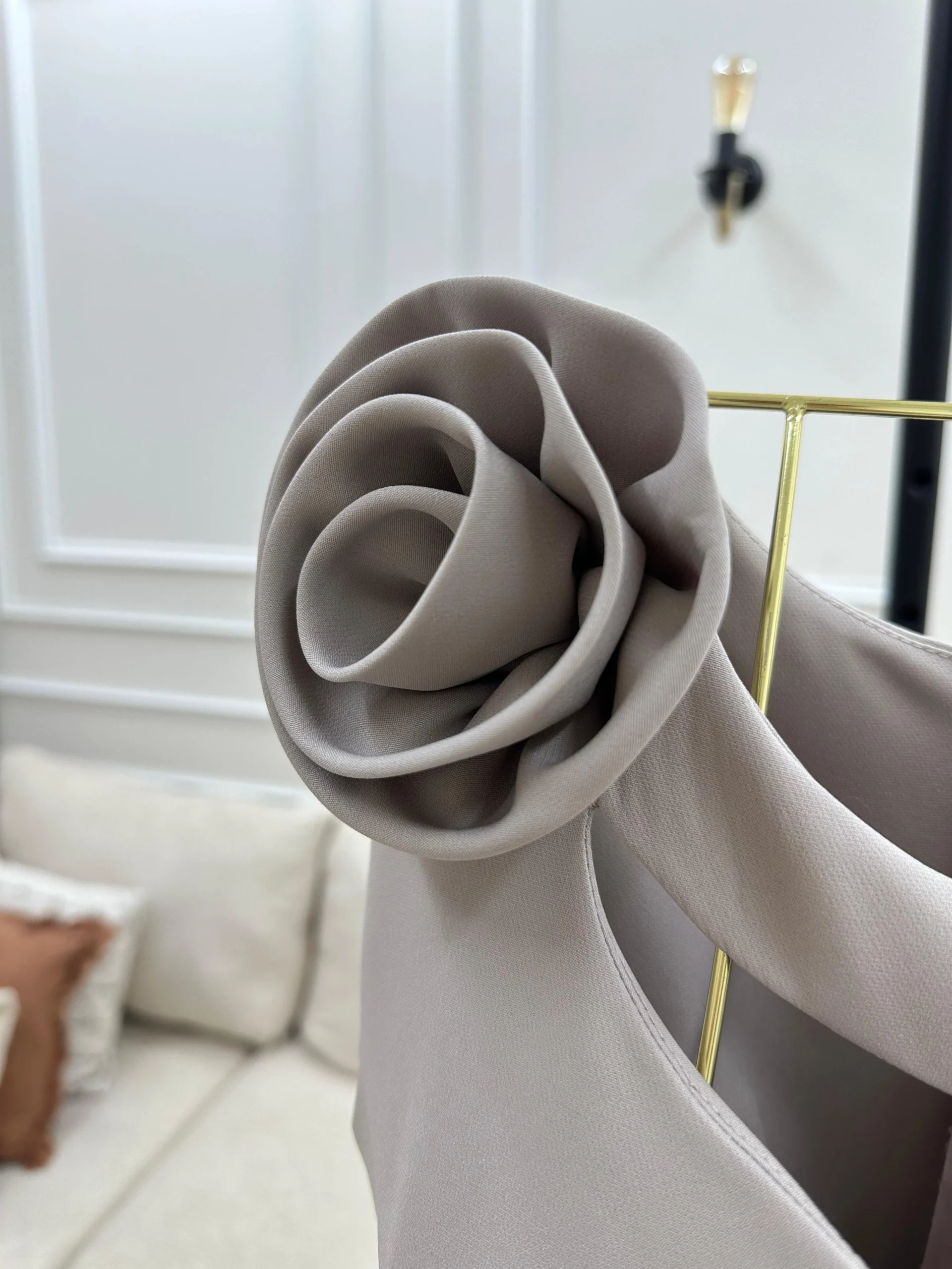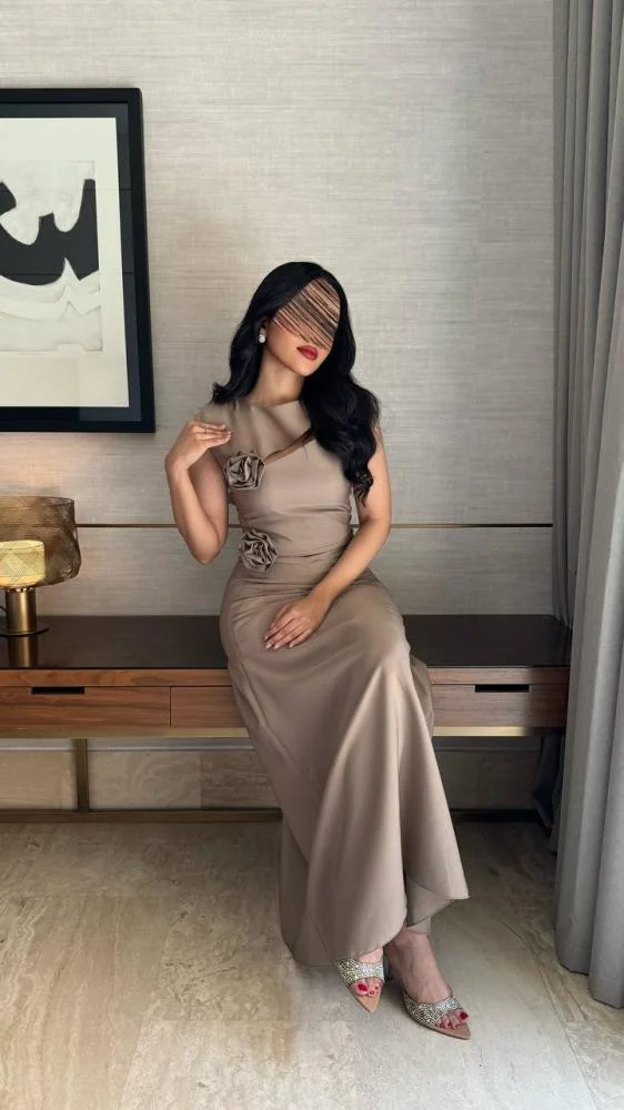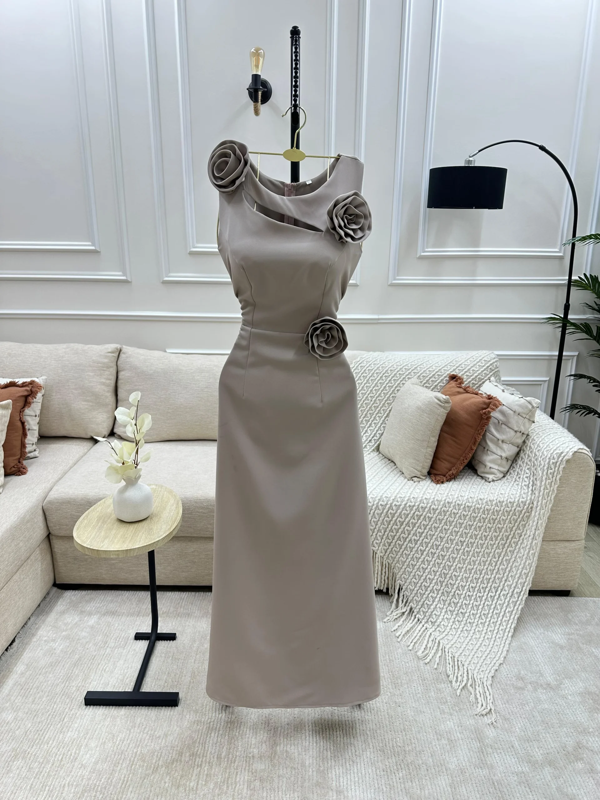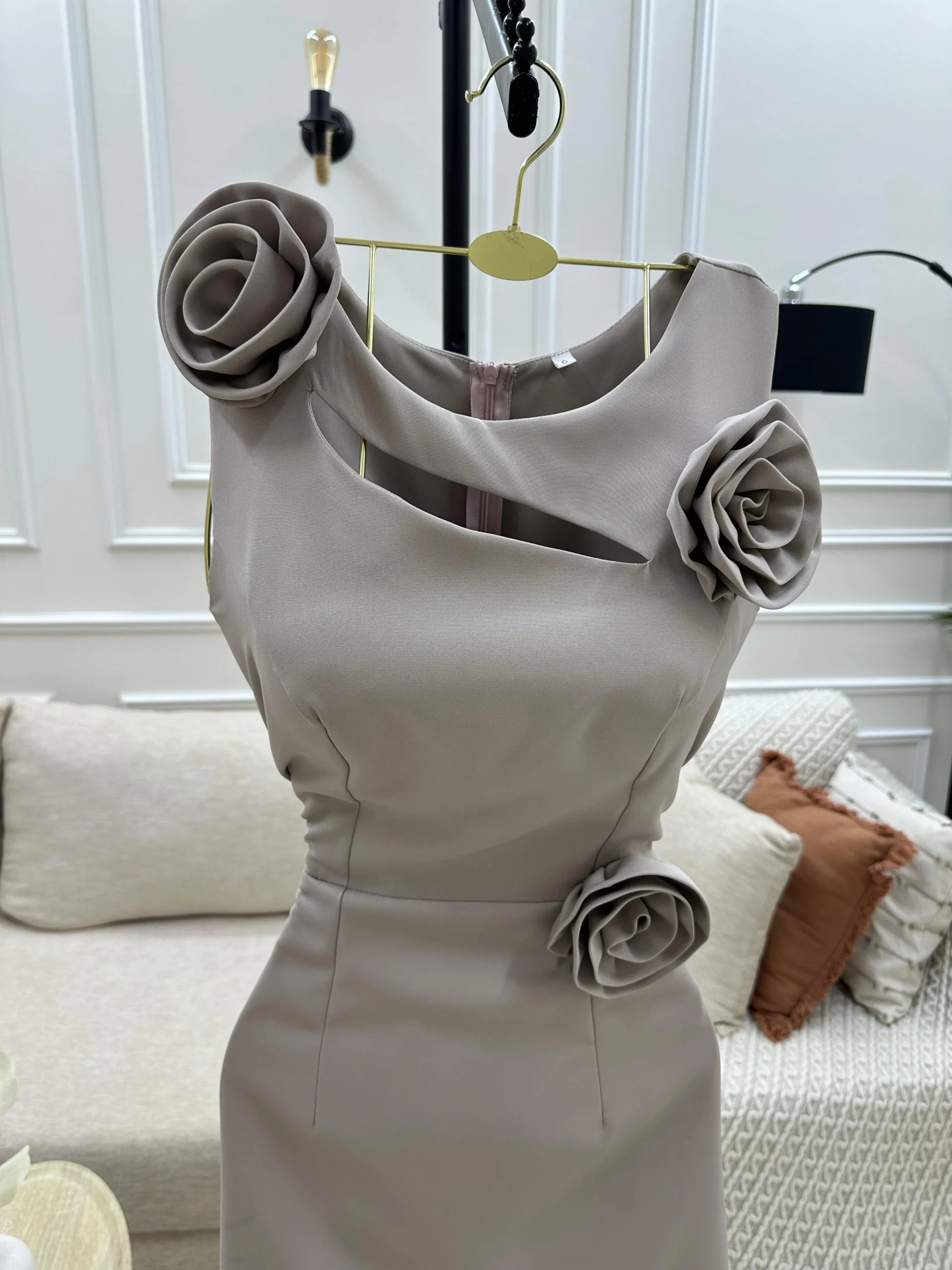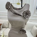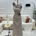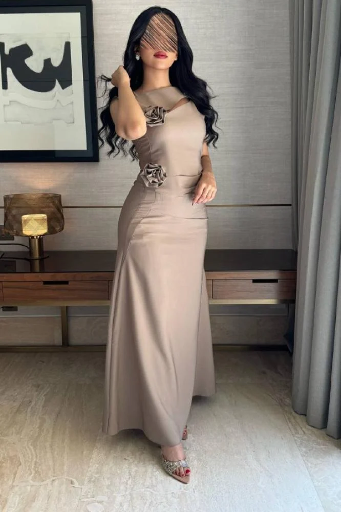 يتألق هذا الفستان بلونه البيج الناعم بتصميم مستوحى من أناقة باربي الكلاسيكية، حيث تأتي الصدرية بدون أكمام بقصة ناعمة وانسيابية، مزينة بثلاث ورود قماشية ضخمة موزعة بعناية على الكتف والصدر والخصر، لتمنح الإطلالة طابعًا فنيًا أنثويًا. أما التنورة الطويلة المنسدلة، فهي تضفي حركة ناعمة وانسيابية ملكية، مما يجعل الفستان مثاليًا للمناسبات الراقية والسهرات الخاصة.