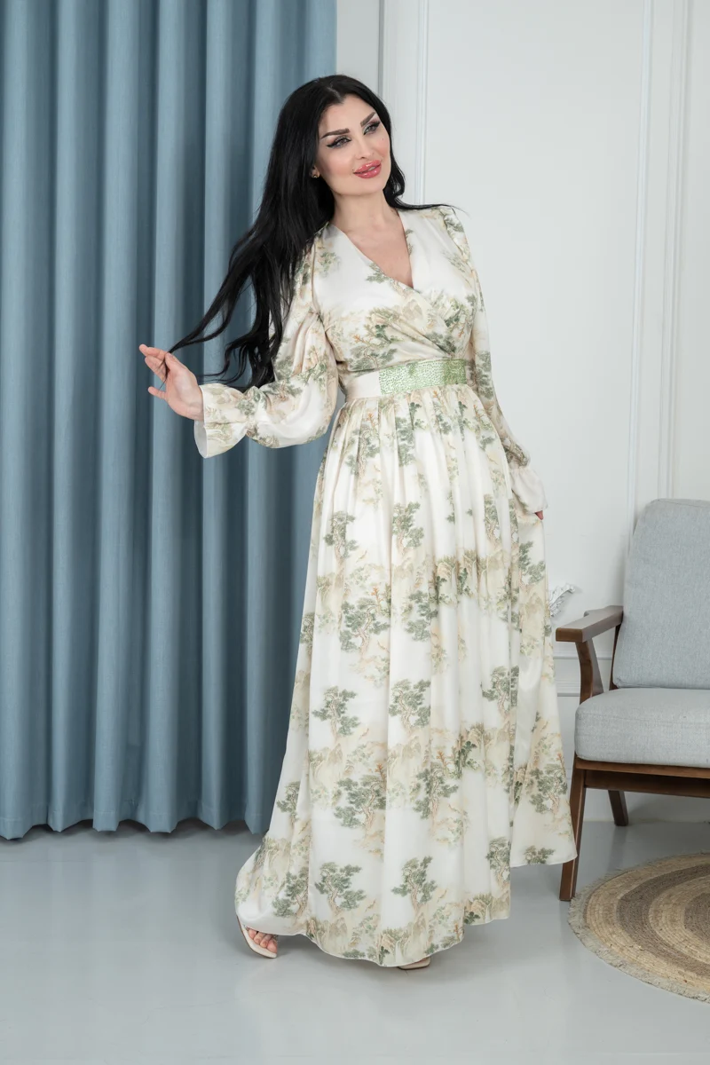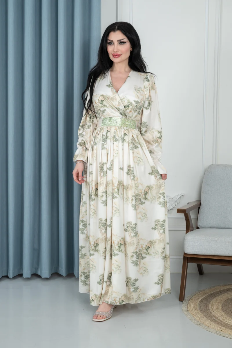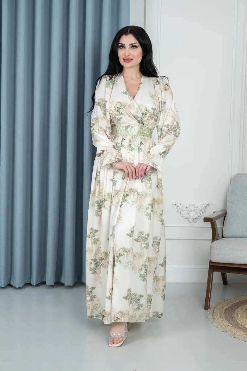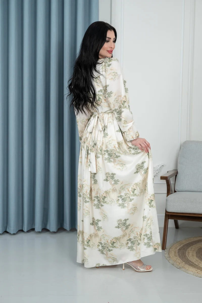 فستان أنيق بطابع كلاسيكي راقٍ، مصنوع من خامة مشجرّة بيضاء لامعة مزينة بنقوش نباتية ناعمة بدرجات الأخضر والبيج، تعكس جمال الطبيعة وهدوئها. يتميّز بقصة طويلة بطول 166 سم، تنسدل بانسيابية بتصميم كلوش يمنح حركة ناعمة وأناقة متزنة.