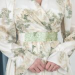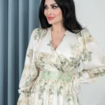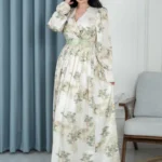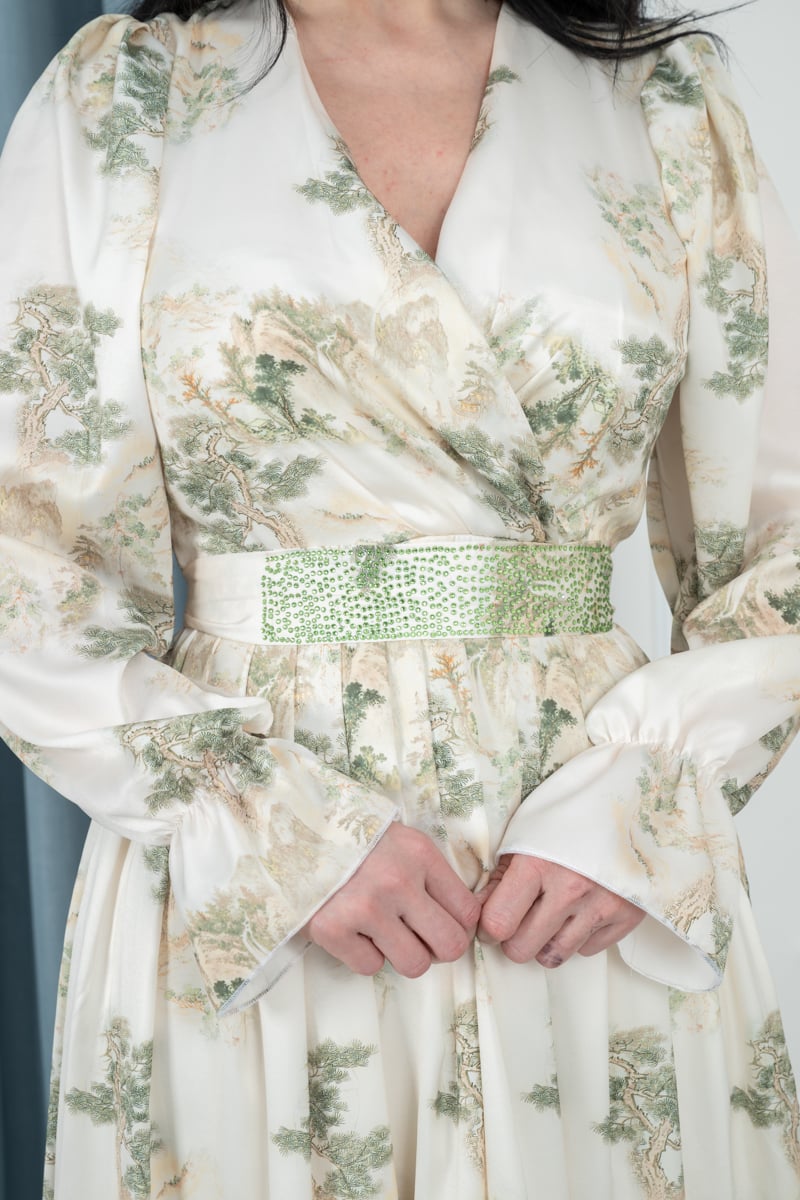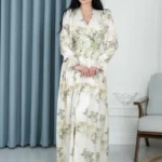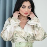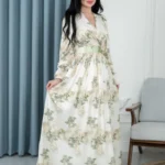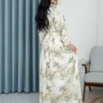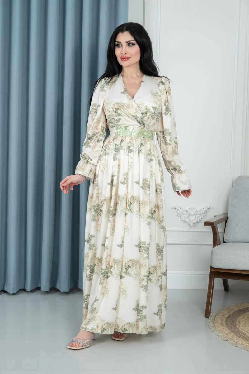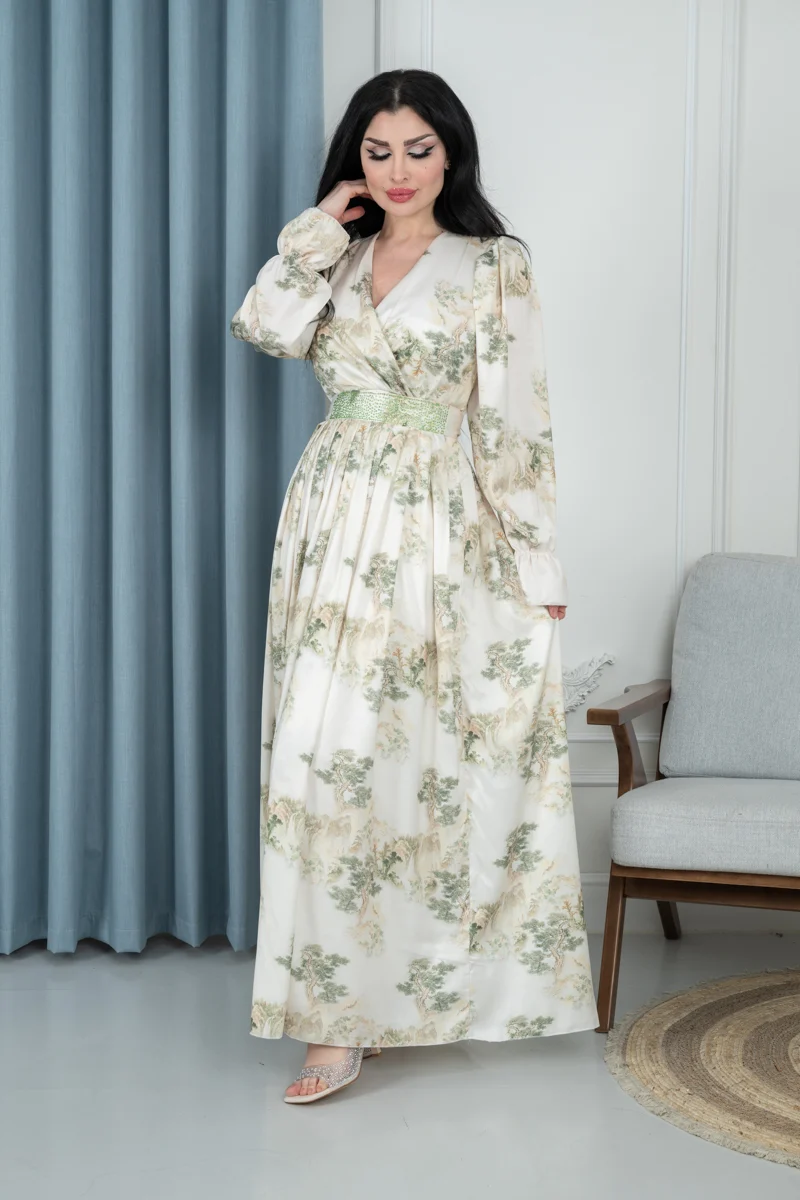 فستان أنيق بطابع كلاسيكي راقٍ، مصنوع من خامة مشجرّة بيضاء لامعة مزينة بنقوش نباتية ناعمة بدرجات الأخضر والبيج، تعكس جمال الطبيعة وهدوئها. يتميّز بقصة طويلة بطول 166 سم، تنسدل بانسيابية بتصميم كلوش يمنح حركة ناعمة وأناقة متزنة.