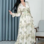 فستان طويل أبيض بنقوش نباتية وأكمام مكشكشة من “نايس موديل”