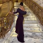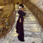 فستان سهرة سحر الكرامش – فستان كريب باربي مكشكش طويل بأكمام منسدلة للمناسبات الراقية ✨💜