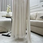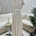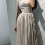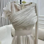 فستان أنثوي فخم مصنوع من قماش الكرنكل بملمسه المجعّد الطبيعي الذي يضفي عمقًا بصريًا وملمسًا فريدًا، يتميّز بقصة علوية ضيّقة بياقة غير متماثلة بأسلوب درابيه ناعم، تعانق الأكتاف والرقبة برقي. التنورة تأتي بتفصيل “دبل كلوش” واسع يمنح حيوية وانسيابية في الحركة، ويعزز فخامة التصميم خاصة عند المشي أو الالتفاف. التكوين العام ينساب على الجسم بسلاسة ويجمع بين الطابع الكلاسيكي واللمسة العصرية.