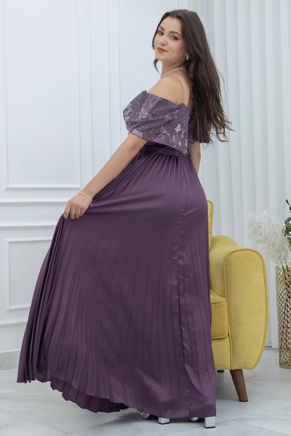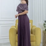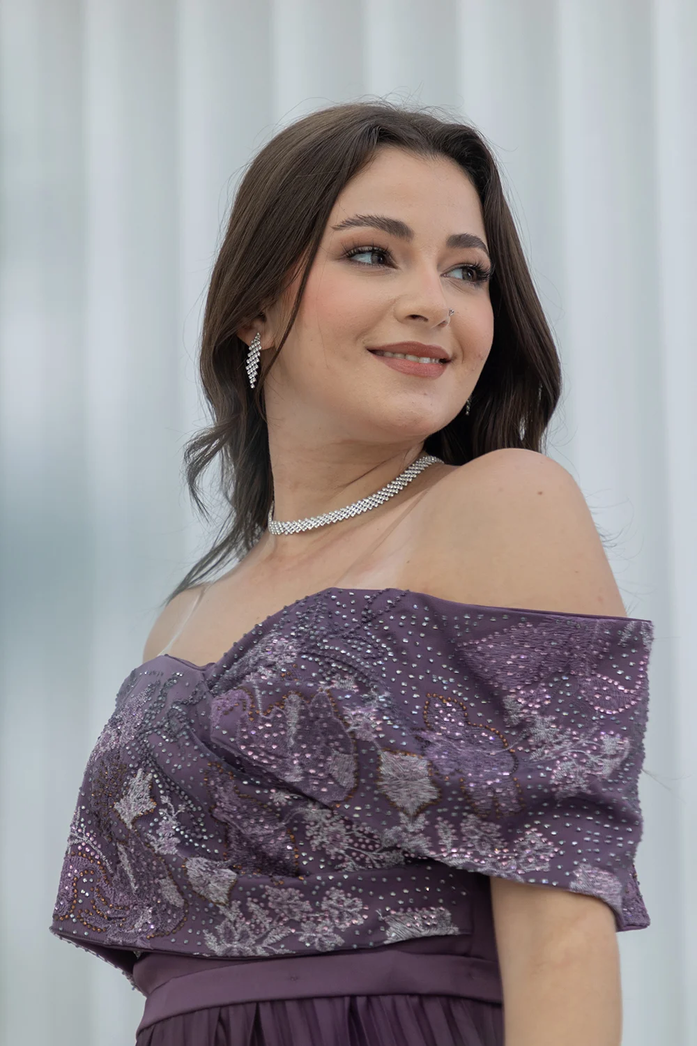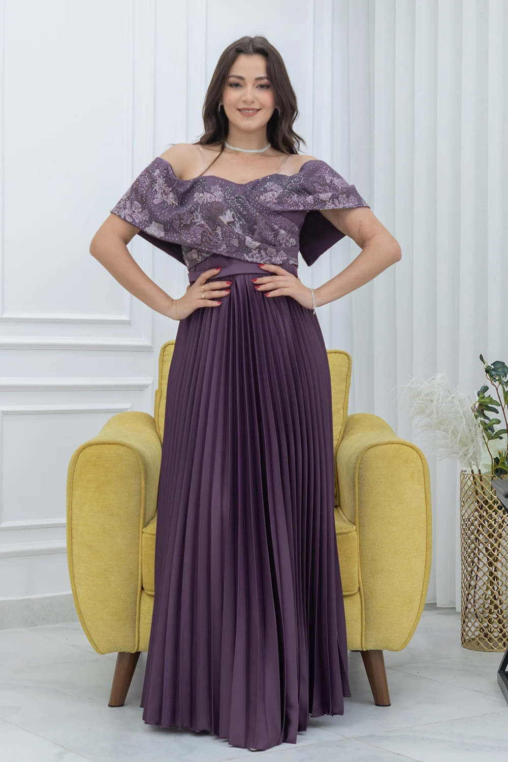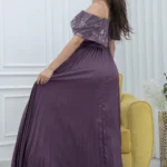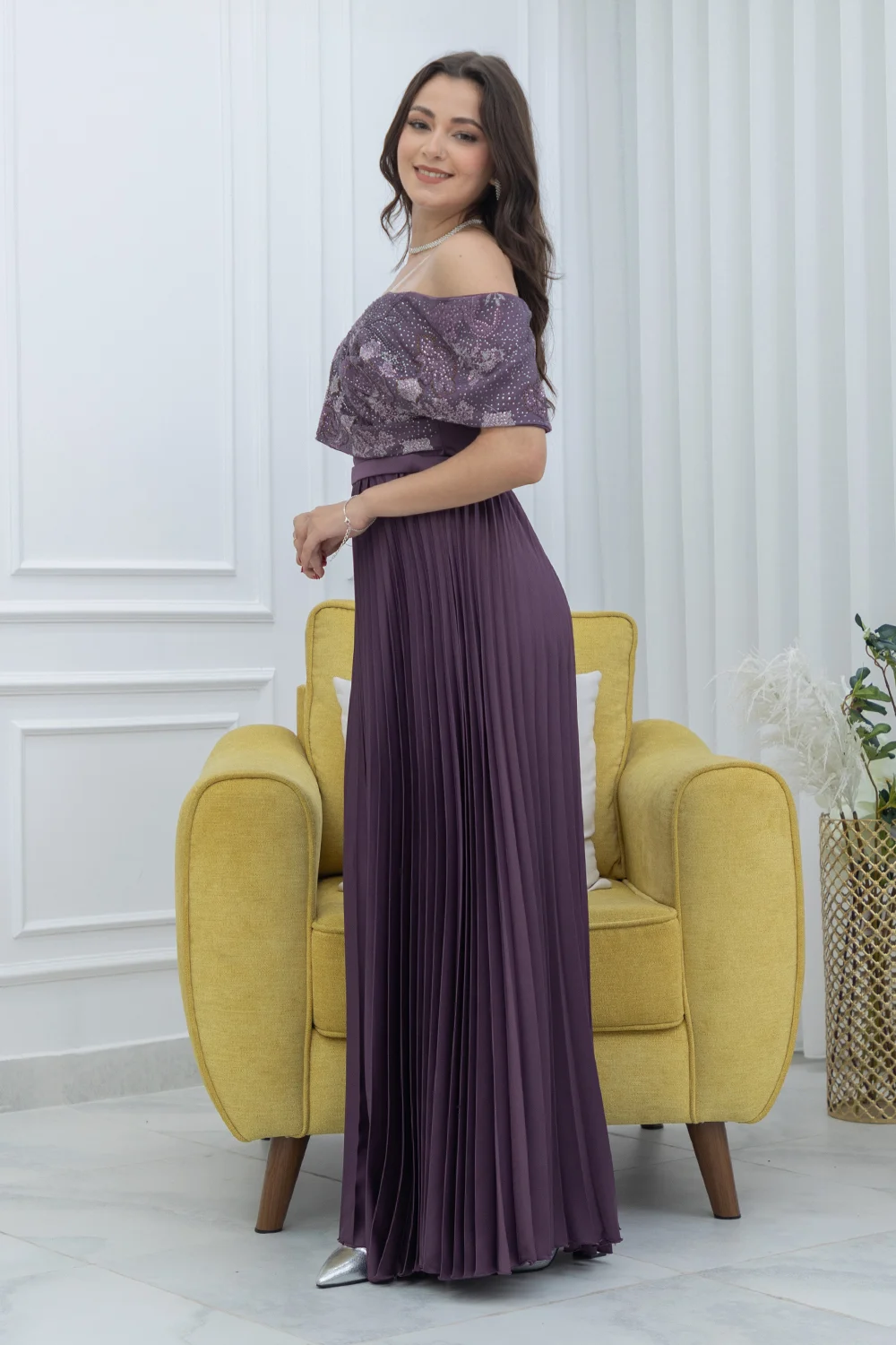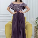 يمنحك هذا الفستان المصنوع من قماش فاخر بلون بنفسجي جذاب إطلالة ملكية راقية. يتميز بتصميم طويل وانسيابي يعزز جمال القوام، مع صدرية مطرزة بتقنية الكمبيوتر والفصوص تضفي لمسة من الفخامة والتألق. تأتي القصة البليسيه في الجزء السفلي لتضيف حركة انسيابية جذابة، مما يجعله خيارًا مثاليًا للمناسبات الفاخرة والسهرات المميزة.