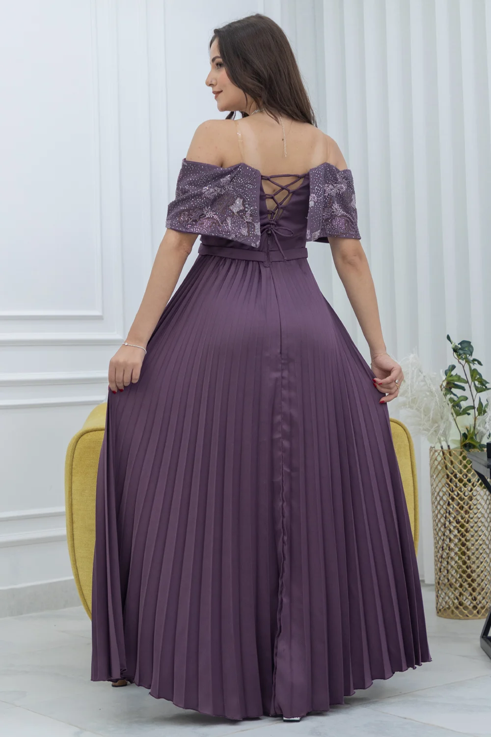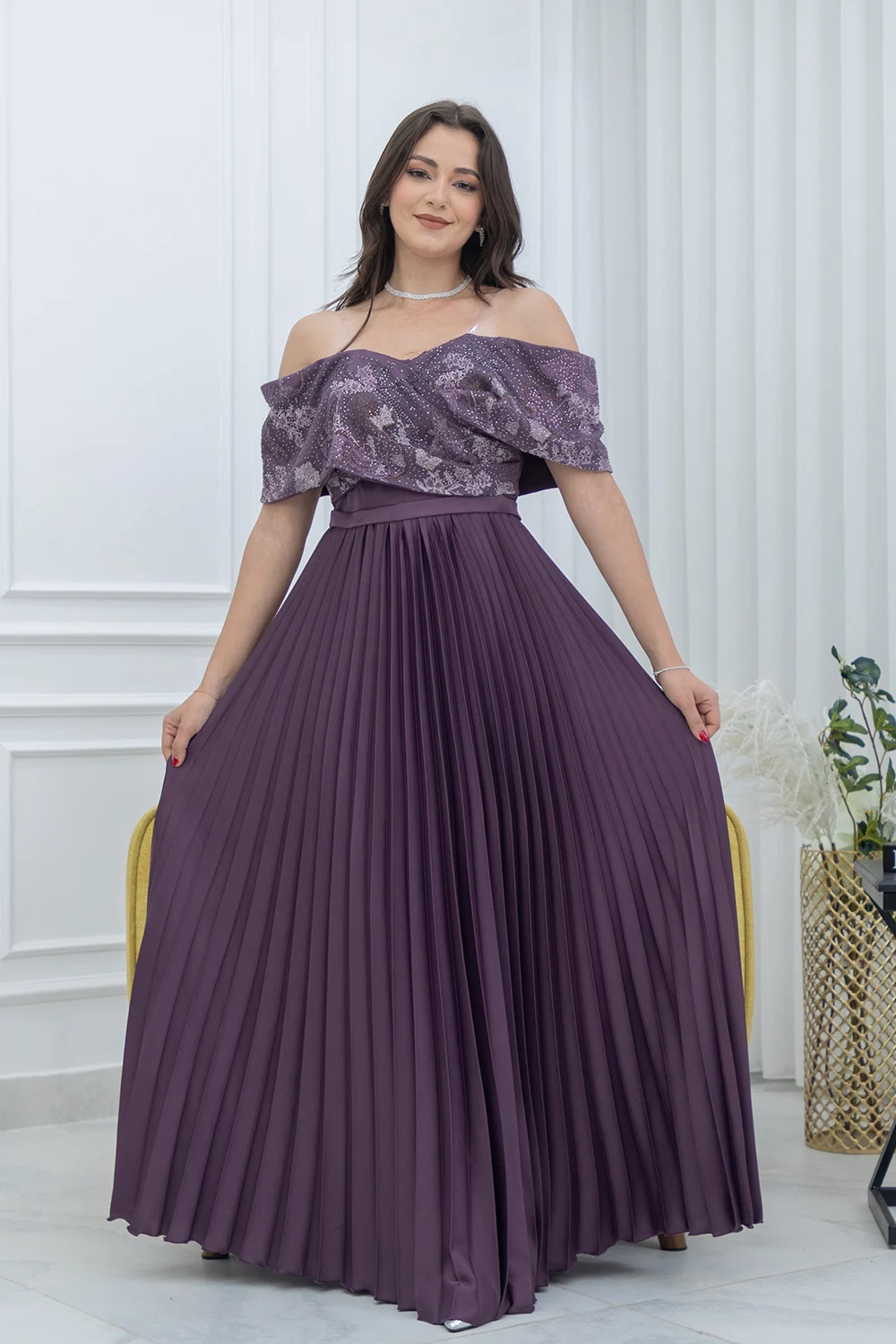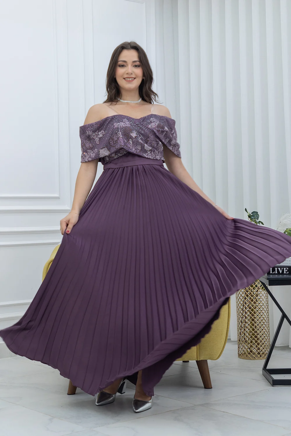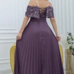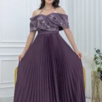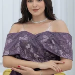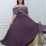 يمنحك هذا الفستان المصنوع من قماش فاخر بلون بنفسجي جذاب إطلالة ملكية راقية. يتميز بتصميم طويل وانسيابي يعزز جمال القوام، مع صدرية مطرزة بتقنية الكمبيوتر والفصوص تضفي لمسة من الفخامة والتألق. تأتي القصة البليسيه في الجزء السفلي لتضيف حركة انسيابية جذابة، مما يجعله خيارًا مثاليًا للمناسبات الفاخرة والسهرات المميزة.
