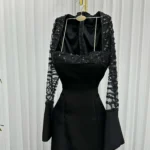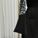 يتميز بأكمام طويلة شفافة مخططة وتفاصيل لامعة على الصدر، تضيف لمسة من الفخامة على التصميم.
