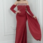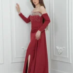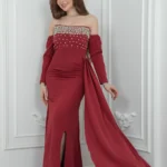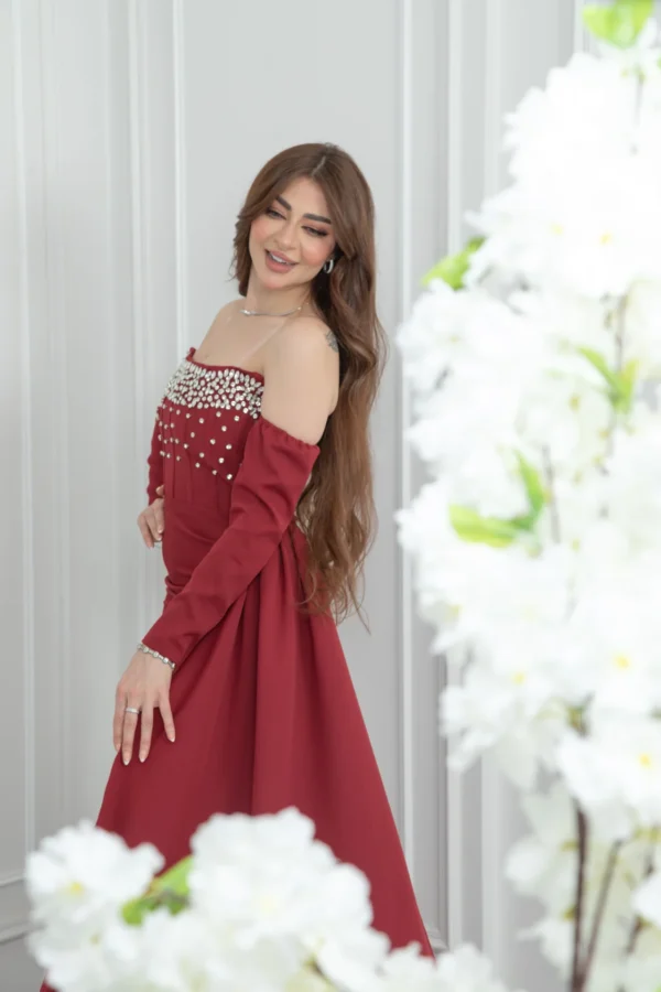 فستان سهرة طويل باربي خمري بتطريز كريستالي وأكمام أوف شولدر