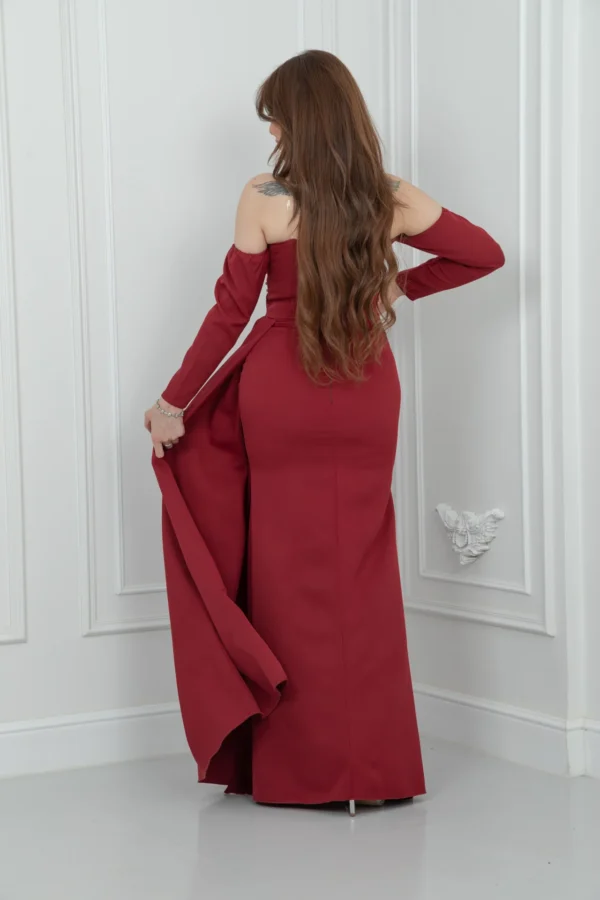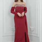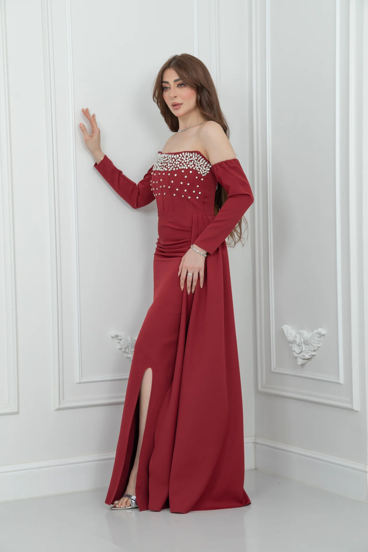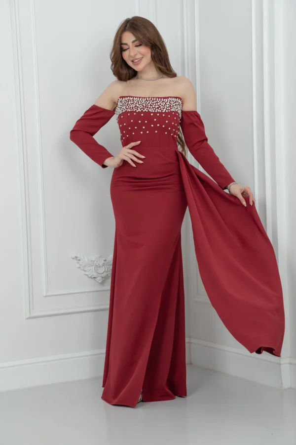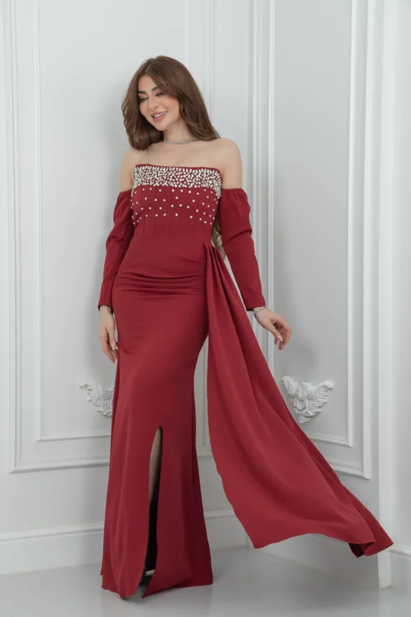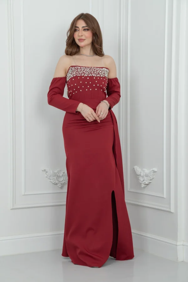 فستان باربي خمري سهرة بقصة ضيقة وتطريز فاخر من كريستالات وخرز، تصميم أوف شولدر بأكمام قابلة للإزالة وقطعة قماش جانبية، مثالي للمناسبات الفاخرة.