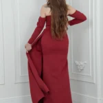 فستان باربي فاخر بلون خمري غني يعكس الأناقة والفخامة بلمسة عصرية. يتميز بتصميم ضيّق من الأعلى يُبرز الخصر بتناغم، مع فتحة أوف شولدر ناعمة وأكمام طويلة قابلة للإزالة تمنحك حرية في تنسيقه حسب المناسبة. الجزء العلوي مزدان بتطريز كريستالات ولمسات لؤلؤ ناعم بتدرج ينساب من الأعلى إلى الأسفل، ما يمنح تأثيرًا بصريًا فاخرًا ومتوازنًا. يكتمل التصميم بقطعة قماش جانبية منسدلة من الخصر تضيف حركة راقية وجاذبية خاصة.
