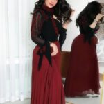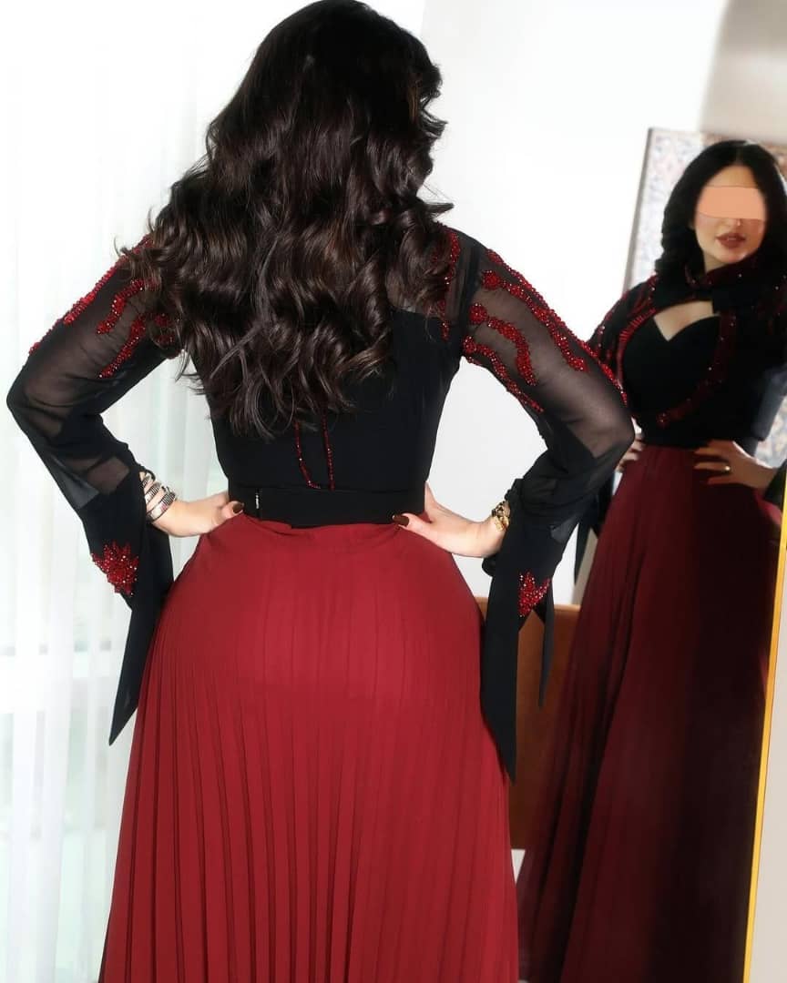 فستان سهرة طويل بتصميم جريء يجمع بين قوة الاسود وتوهج الاحمر بتناسق ملفت. يتميز بصدرية ضيقة مصنوعة من قماش باربي الناعم تمنح ثباتًا وانسيابية مثالية، مع خصر محدد يعزز جمال القوام. الاكمام مصنوعة من التل الشفاف باسلوب انثوي ناعم يضفي غموضًا جذابًا على الذراعين. التنورة تأتي من قماش شيفون بليسيه بلون احمر متوهج بتصميم متمايل وانسيابي يعكس الحركة بجاذبية. الفستان يجمع بين الفخامة والجرأة بأسلوب متقن