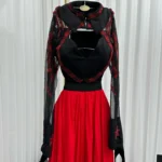 - التزيين: بدون تطريز، بل توزيع لوني جريء بين الاسود والاحمر