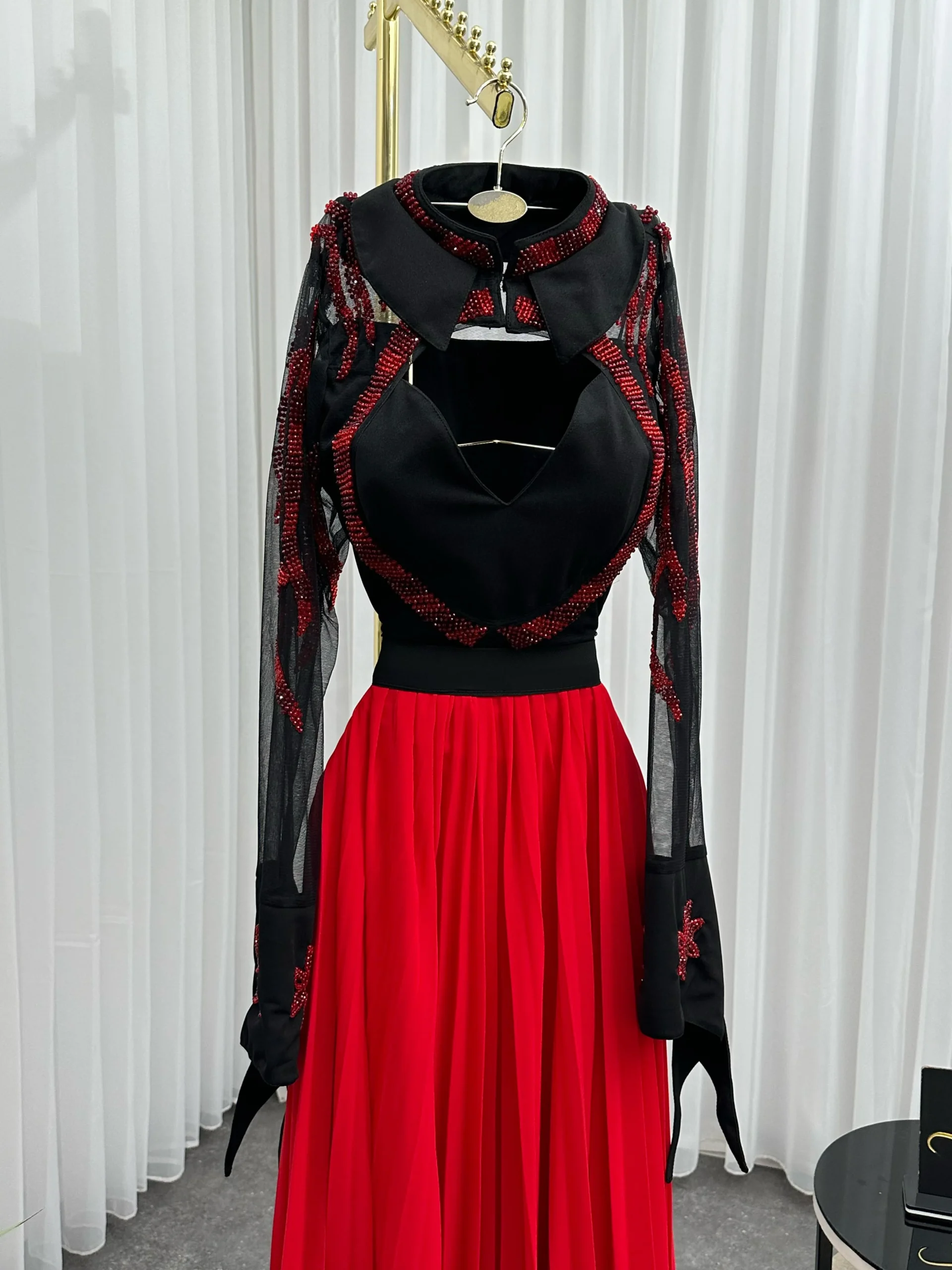 فستان سهرة طويل بلون اسود واحمر بدون تطريز، يجمع بين خامات الباربي والتل والشيفون بليسيه، مثالي لحفلات العيد، مناسبات الخطوبة، السهرات الرسمية واعراس المساء. يندرج ضمن فساتين سهره ناعمه، فساتين جريئة، فساتين بكم شفاف، واطلالات خليجية انيقة