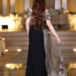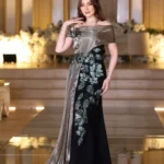evening gown with pleated cape – metallic barbie dress – floral embroidery – off shoulder black dress – khaliji occasion wear