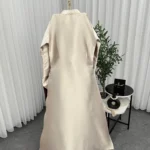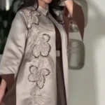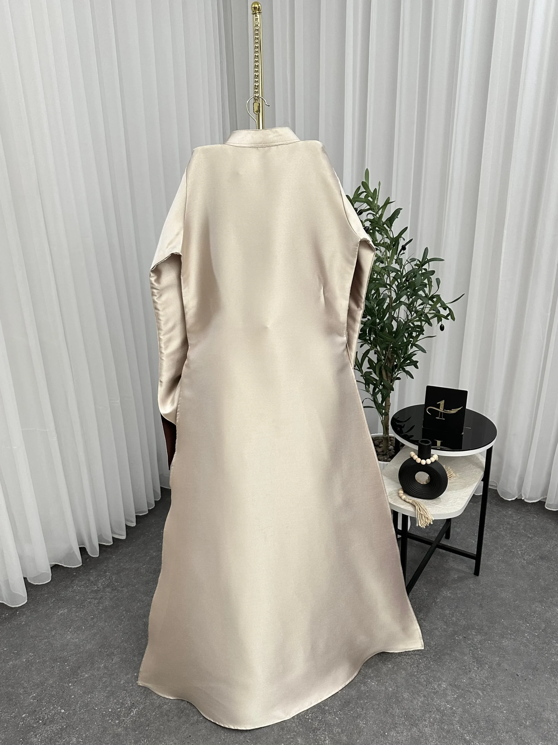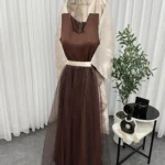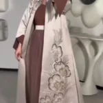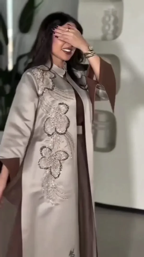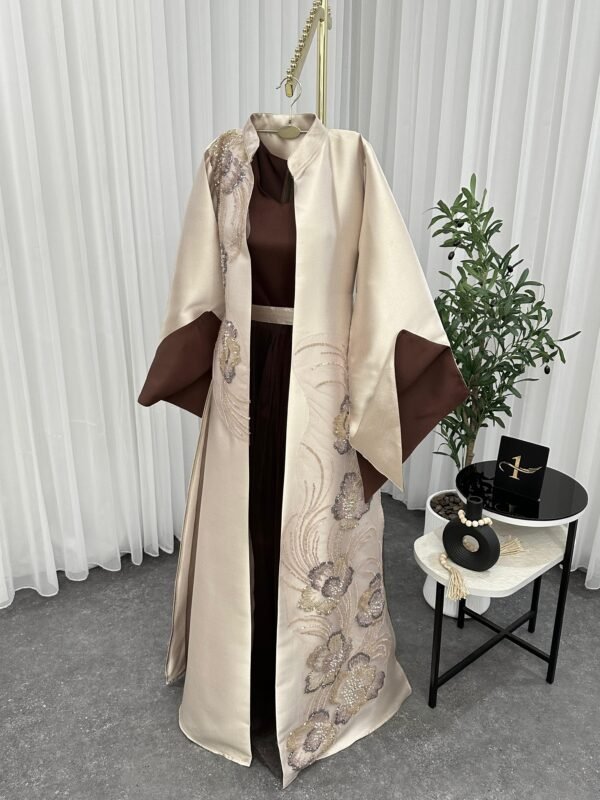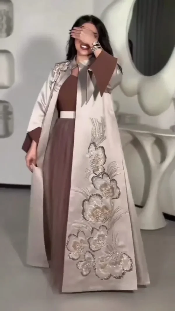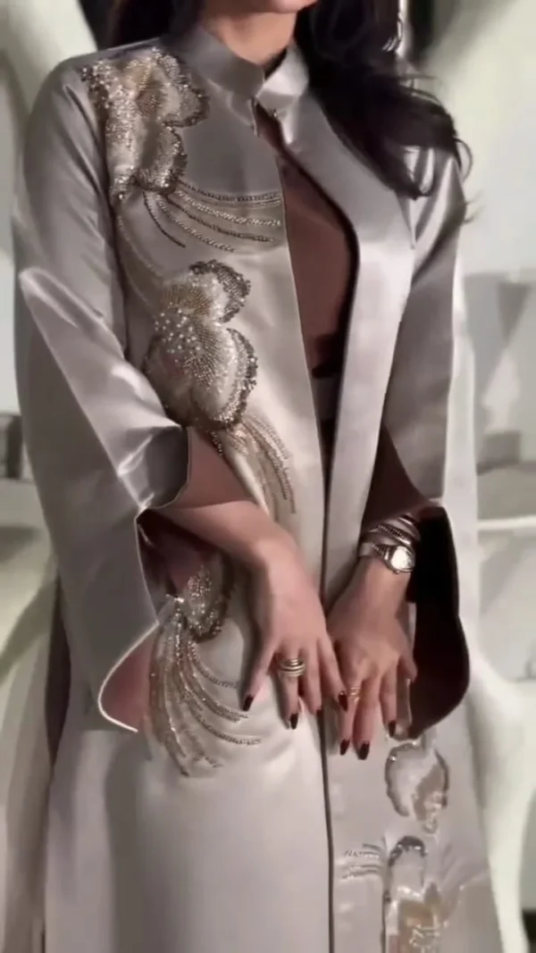 فستان سهرة أنيق وفاخر يجمع بين أصالة التفاصيل العصرية وفخامة الأقمشة. مصنوع من ميكادو البشت الفاخر للجزء الخارجي، مع صدريّة من قماش باربي الناعم تمنح راحة وانسيابية جذّابة، وتنورة من التل الخفيف تضيف شفافية ناعمة وانسيابًا حالِمًا. يتزين بتفاصيل تطريز دقيق ولمسات براقة تعكس جمال ملكي، بينما الأكمام الواسعة تضيف حضورًا واثقًا يلفت الأنظار.