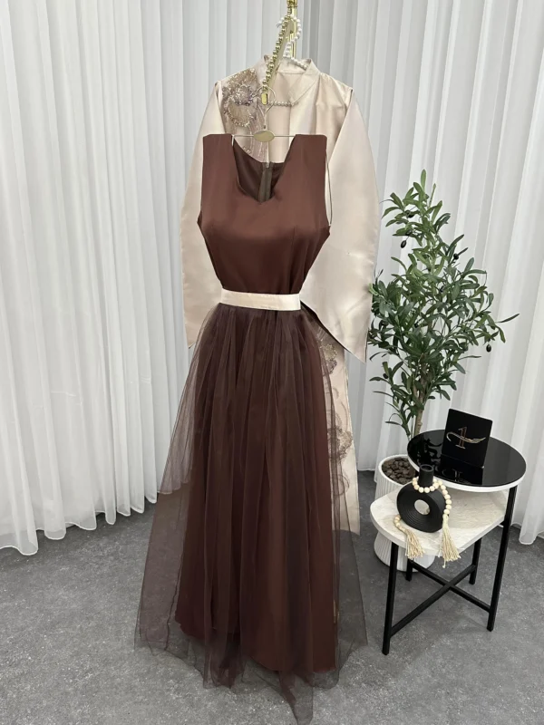 فستان مناسبات ملكي طويل يجمع بين ميكادو البشت، الباربي الناعم، وتنورة تل مطرزة، يضمن لك حضورًا فاخرًا في السهرات، الأعراس والخطوبة.