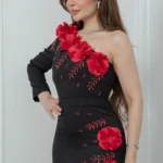 فستان باربي أسود أنيق يتميّز بقصّة ضيّقة مستقيمة تُبرز جمال القوام بلمسة راقية. تصميم الكتف الواحد يضفي لمسة عصرية جريئة، بينما يزيّن الجزء العلوي ورود حمراء بارزة ثلاثية الأبعاد تنسدل بتناغم من الكتف حتى الأسفل، مع تناثر خرزات صغيرة باللون الأحمر تضيف لمعة فريدة وتفاصيل فنية ملفتة للنظر.