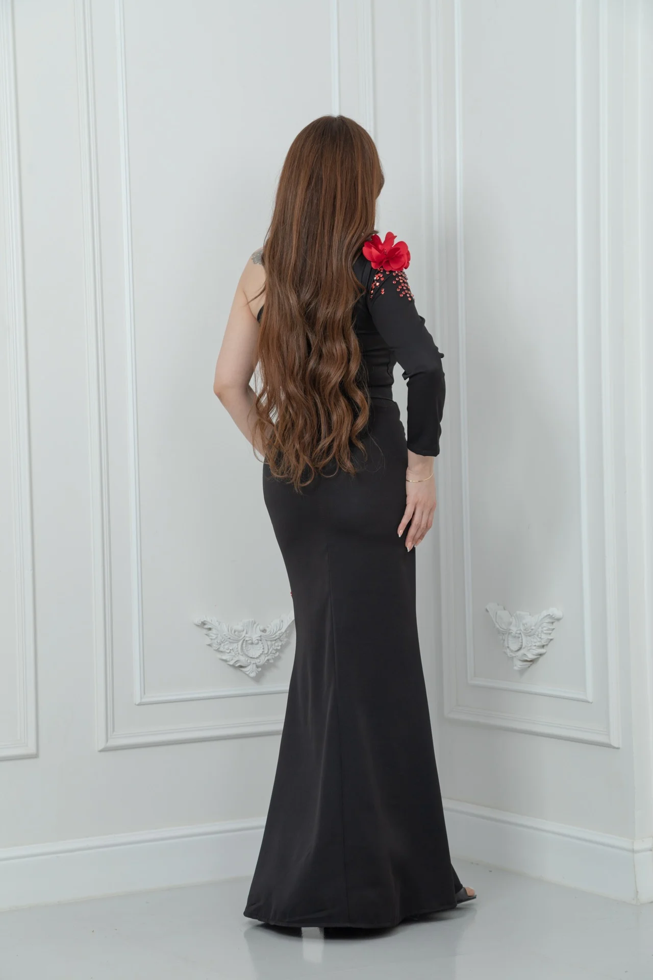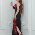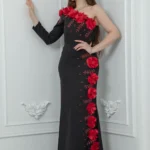 فستان باربي أسود ناعم بكتف واحد، مزين بورود حمراء ثلاثية الأبعاد وخرز يدوي فاخر، بقصة ضيقة مثالية للسهرات والمناسبات الفاخرة