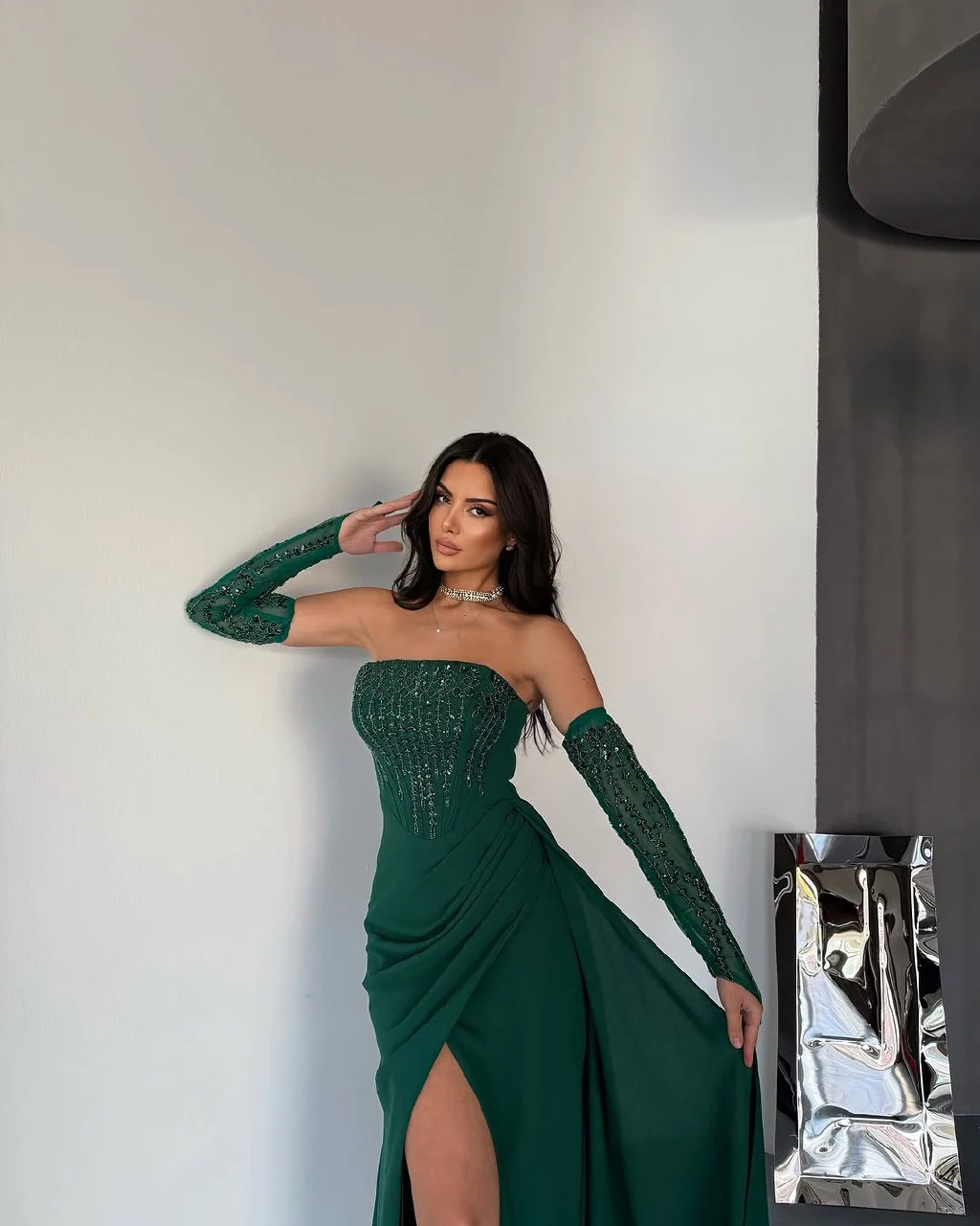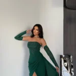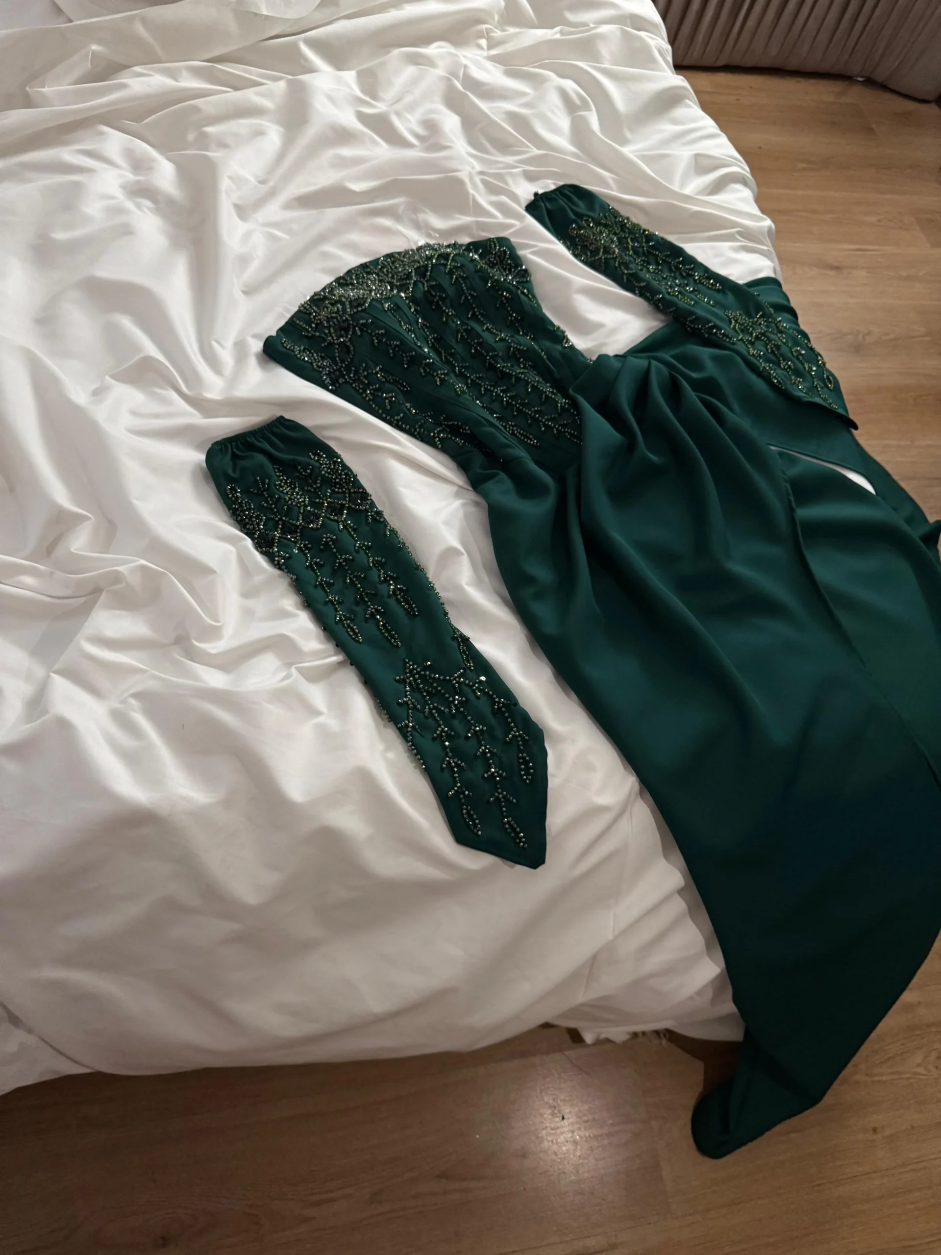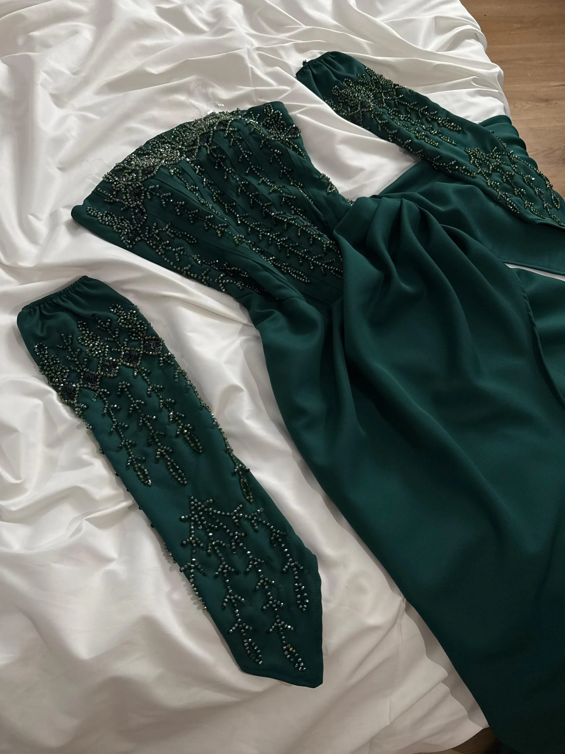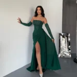 فستان سهرة طويل من قماش الباربي الفاخر، بلون زمردي غني يوحي بالفخامة والرقي. يتميز التصميم بقصة ضيّقة عند الخصر مع تنورة تنسدل بانسيابية ناعمة وبفتحة أمامية تضيف لمسة جريئة وأنيقة. الصدر مزين بتطريز يدوي فاخر على شكل أغصان متفرعة، ويمتد نفس النمط المطرز على الأكمام المنفصلة التي تضفي طابعًا ملكيًا فاخرًا. الفستان بدون أكتاف مما يعزز جمال الأكتاف والرقبة، ويجمع بين الأنوثة والتفاصيل الراقية في توازن مثالي.