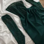 فستان سهرة ناعم بتطريز يدوي بلون زمردي، مثالي للمناسبات الراقية، حفلات الخطوبة، تصوير السوشيال ميديا، سهرات العيد، واللقاءات العائلية. يناسب الذوق الخليجي الراقي ويُظهر جمال القوام بلمسة ملكية.