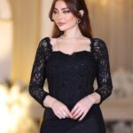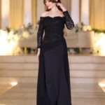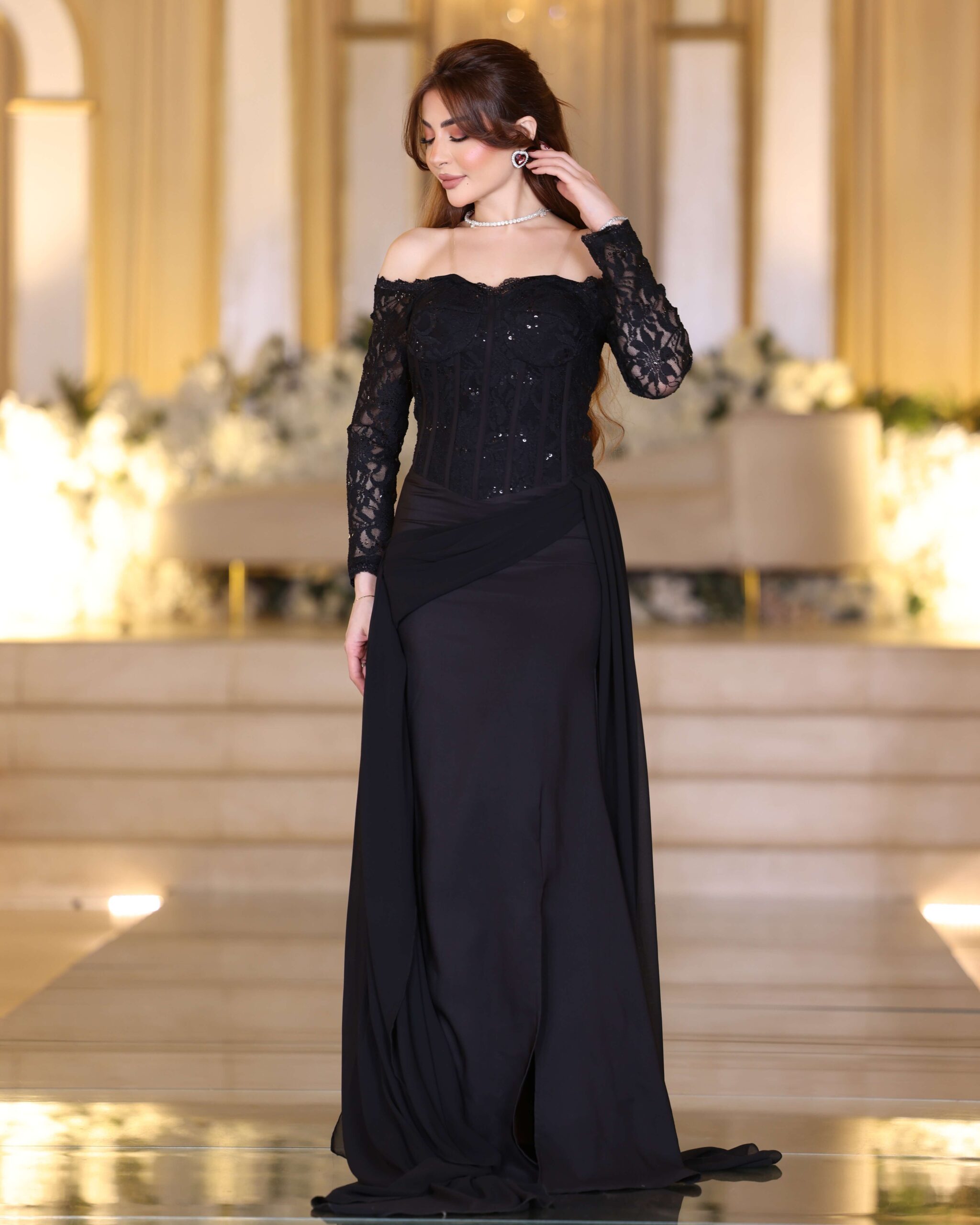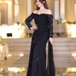 فستان سهرة طويل بكتف ساقط وتطريز فاخر