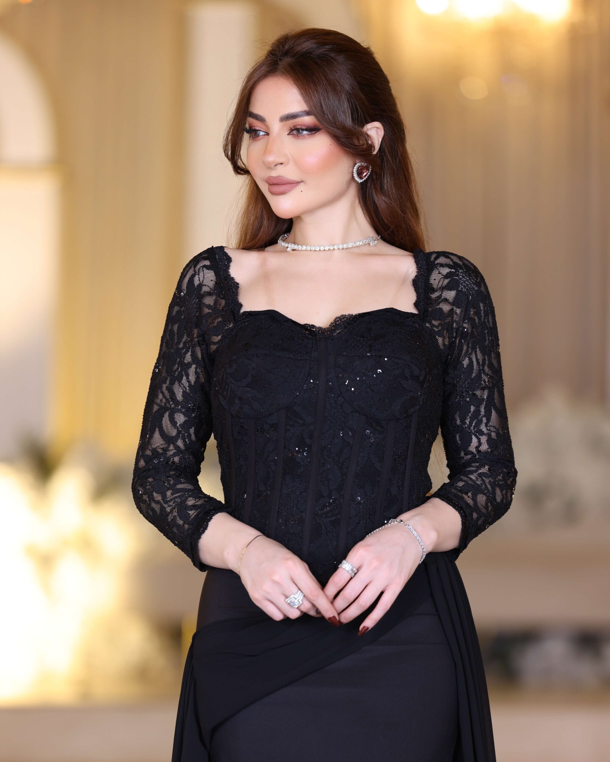 - الإكسسوارات: عقد ماسي ناعم وأقراط قصيرة