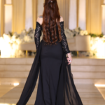 شعر مفرود بتموجات ناعمة مع نصف رفعة لإبراز فتحة الكتف بتفاصيلها الملكية.