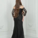- فستان سهرة دانتيل أسود بقصة ضيقة وتطريز فاخر، أكمام شفافة قابلة للإزالة مع كسرات خصر وكشكش جانبي أنيق، مثالي للمناسبات الراقية.