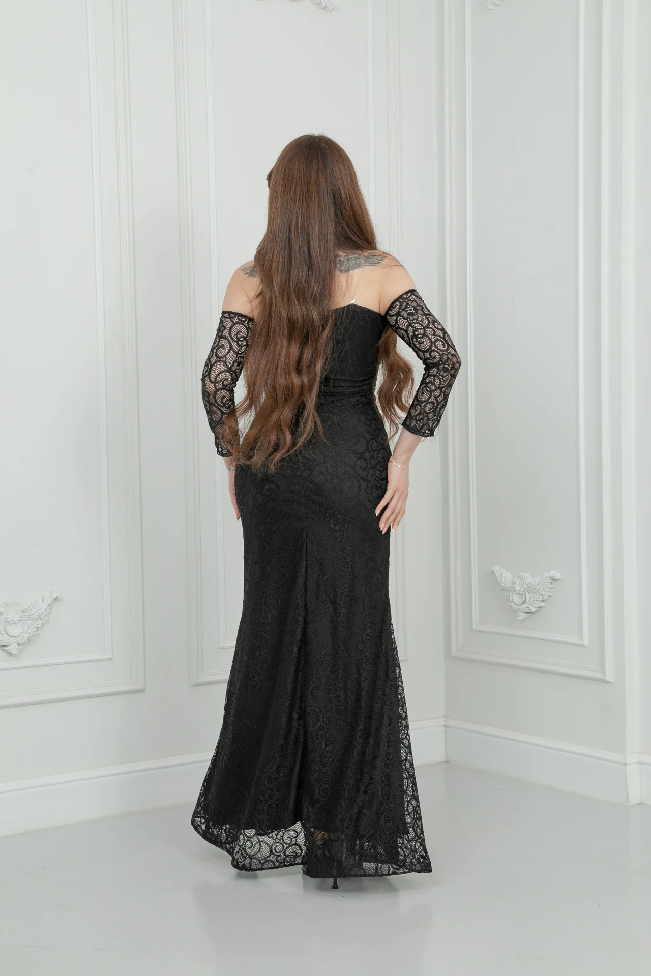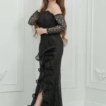 فستان سهرة طويل دانتيل أسود بكسرات وتطريز فاخر