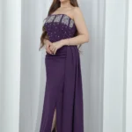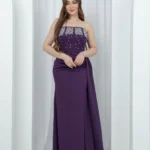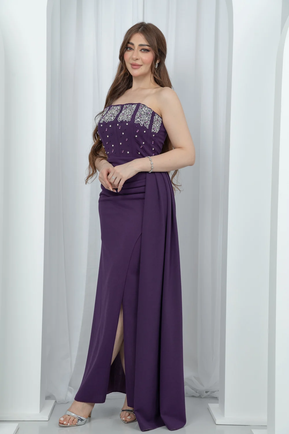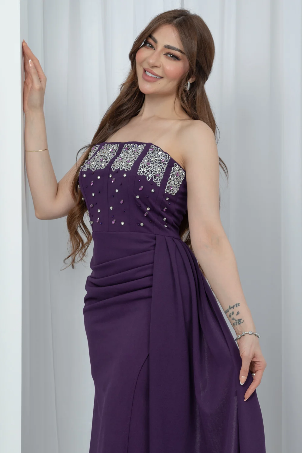 فستان سهرة طويل كريب بنفسجي بدون أكتاف بتطريز فاخر
