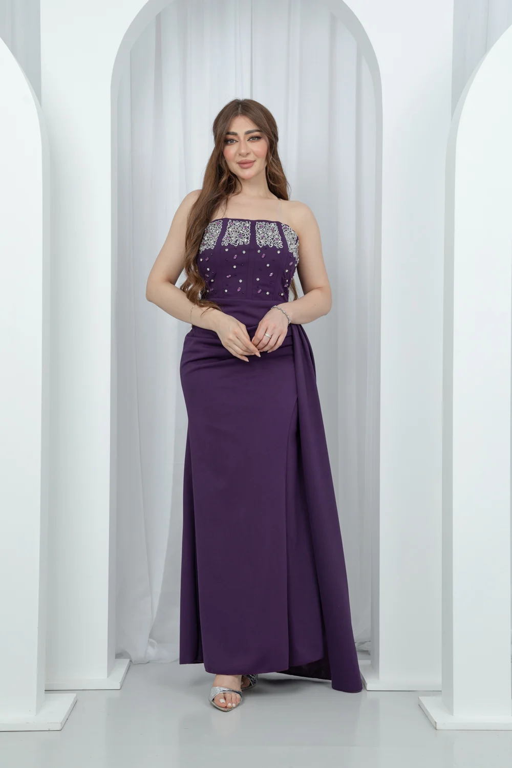 فستان سهرة بنفسجي فاخر بقصة سترابلس ضيّقة وتطريز لؤلؤي ناعم، مثالي لحفلات الخطوبة، السهرات الفاخرة، المناسبات الخاصة، أو العشاء الرسمي. تصميمه الجذاب يبرز القوام بأناقة ويعكس أنوثة راقية تلائم ذوق المرأة الخليجية العصرية.