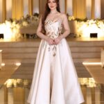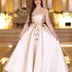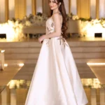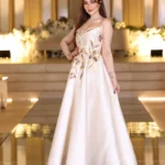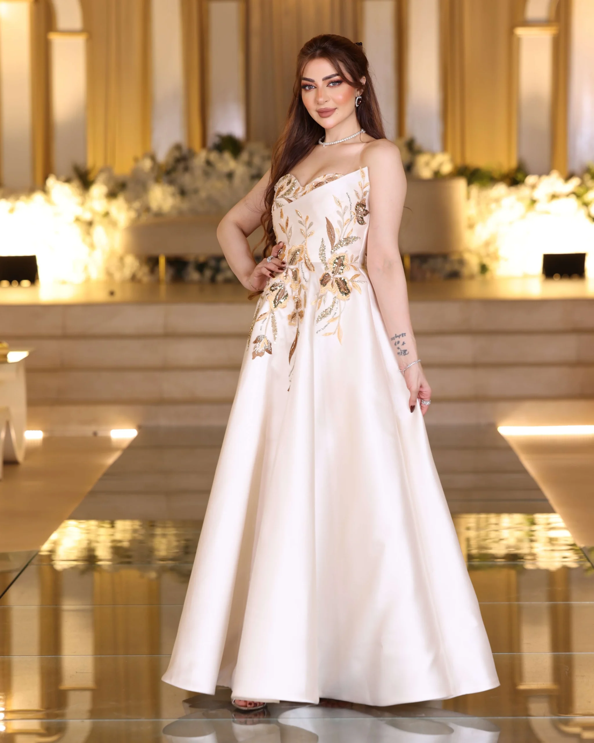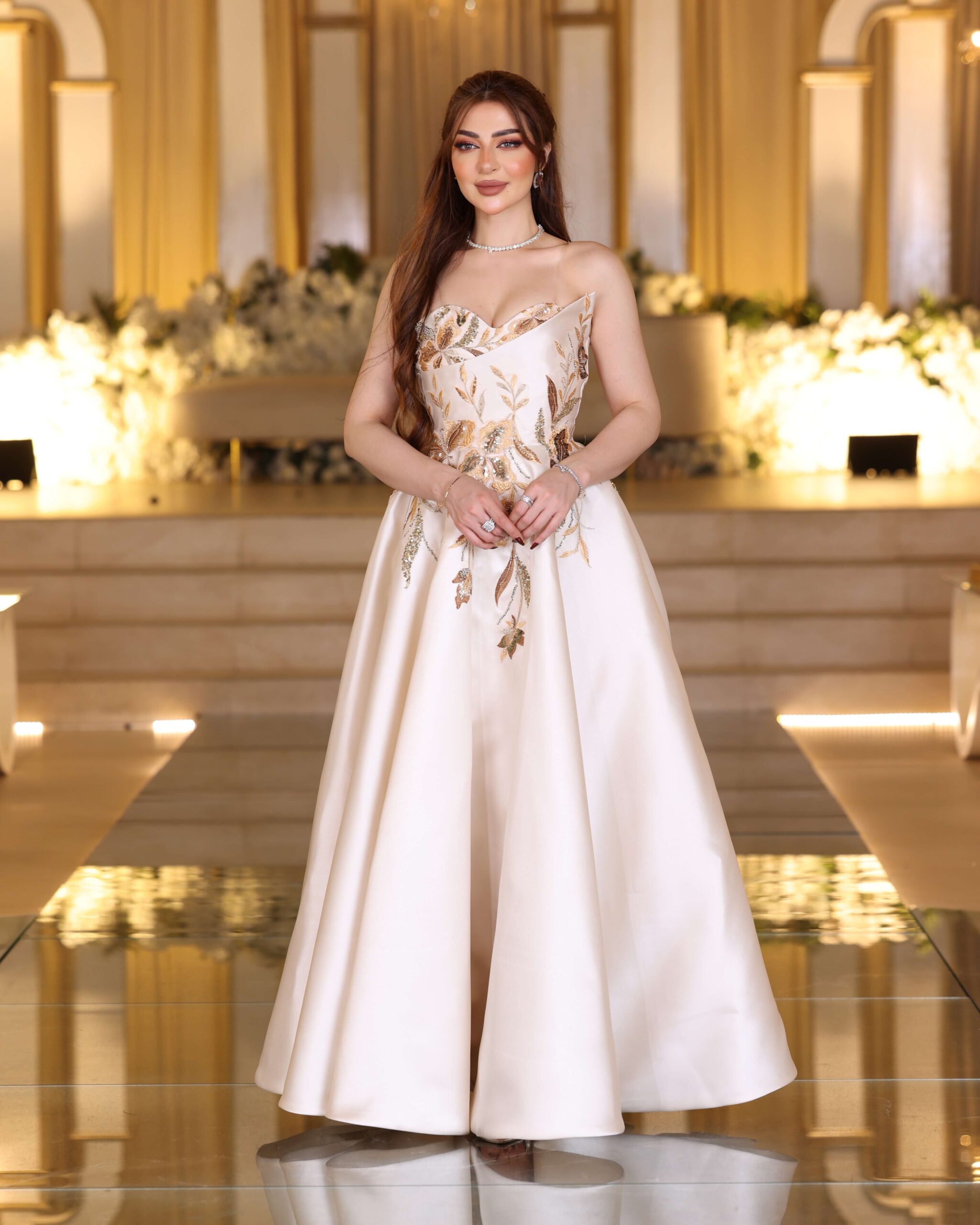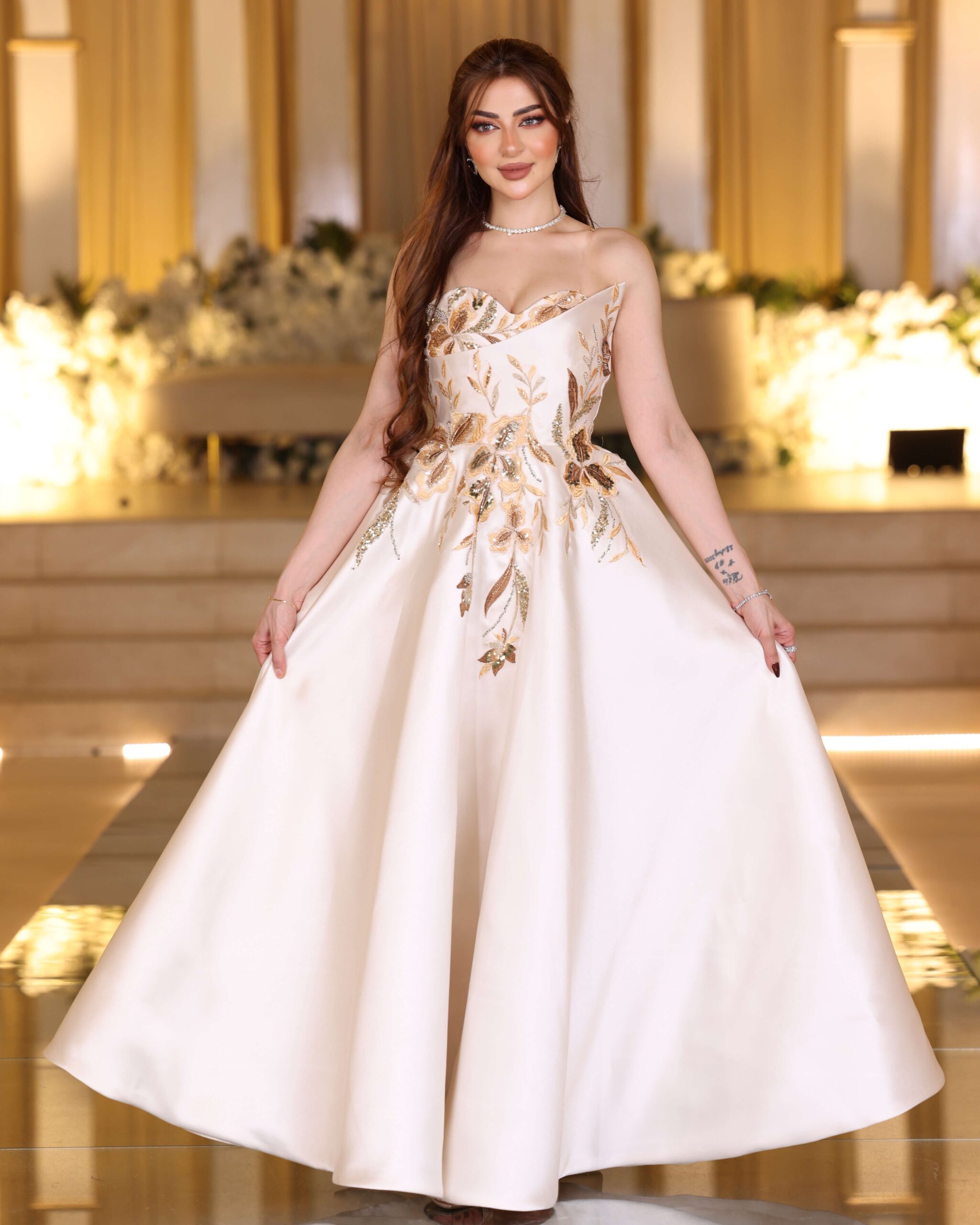تصميم ملكي أنيق بلون أوف وايت فاخر يمنحك حضورًا مميزًا في كل مناسبة. يأتي الفستان بقصة صدر مستقيمة تنسدل إلى تنورة واسعة بانسيابية راقية. الجزء العلوي مزين بتطريز يدوي فاخر مستوحى من الزهور، باستخدام خيوط ذهبية ولمعة ناعمة تمنح الفستان لمسة أنثوية راقية. الخامة من الميكادو الثقيل تضيف ثباتًا مثاليًا للفستان وتمنحه هيكلًا فاخرًا يليق بالمناسبات الرسمية.