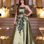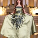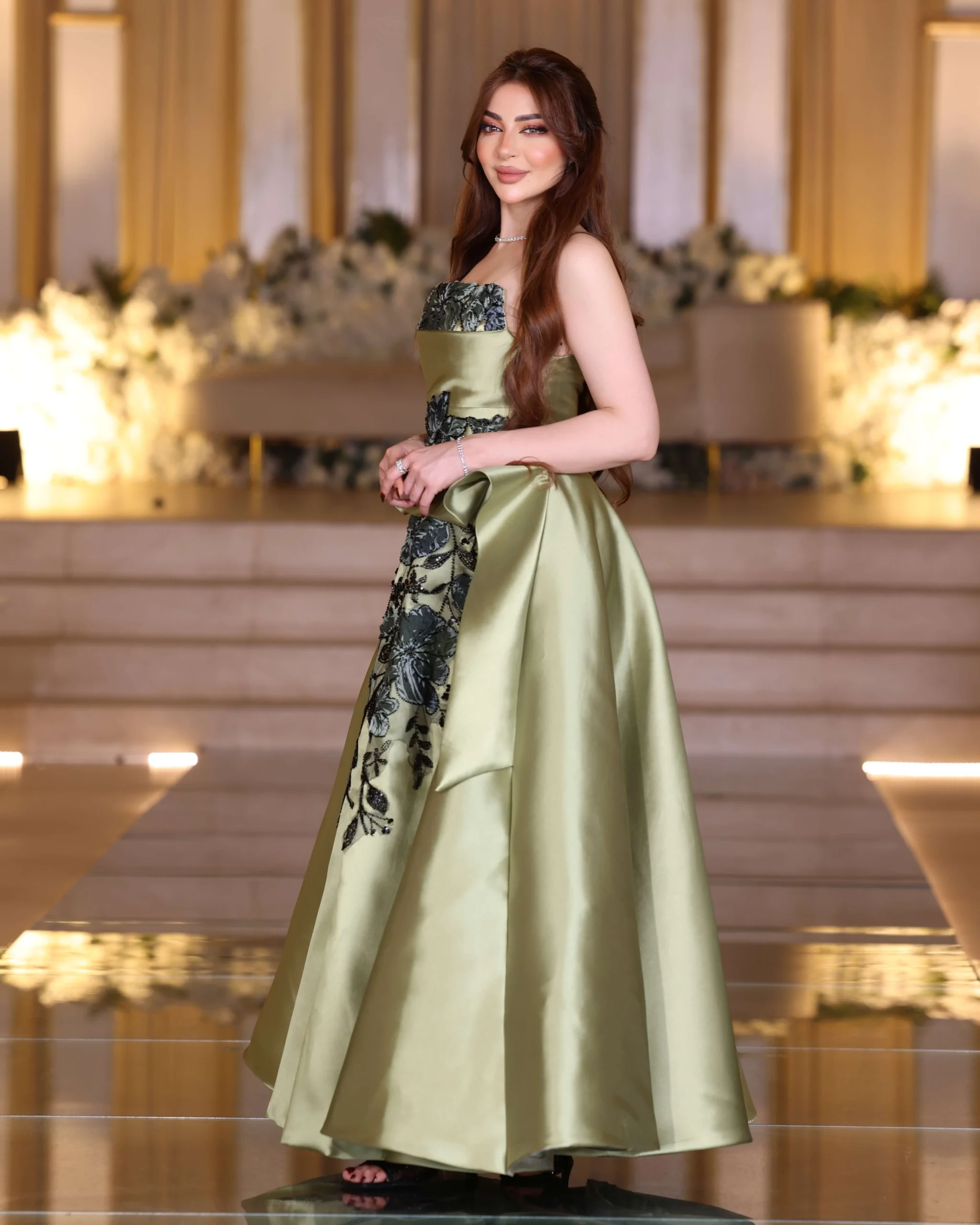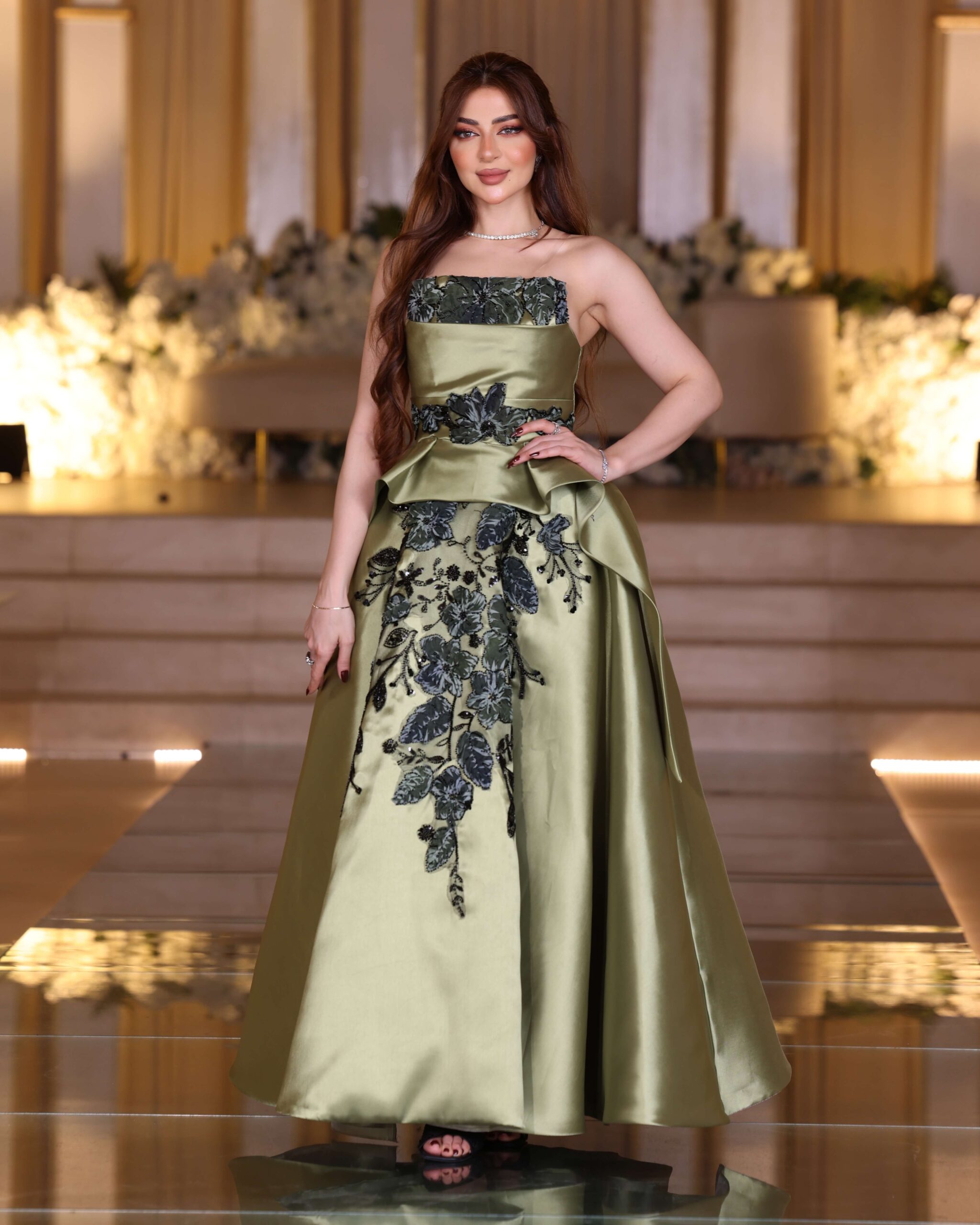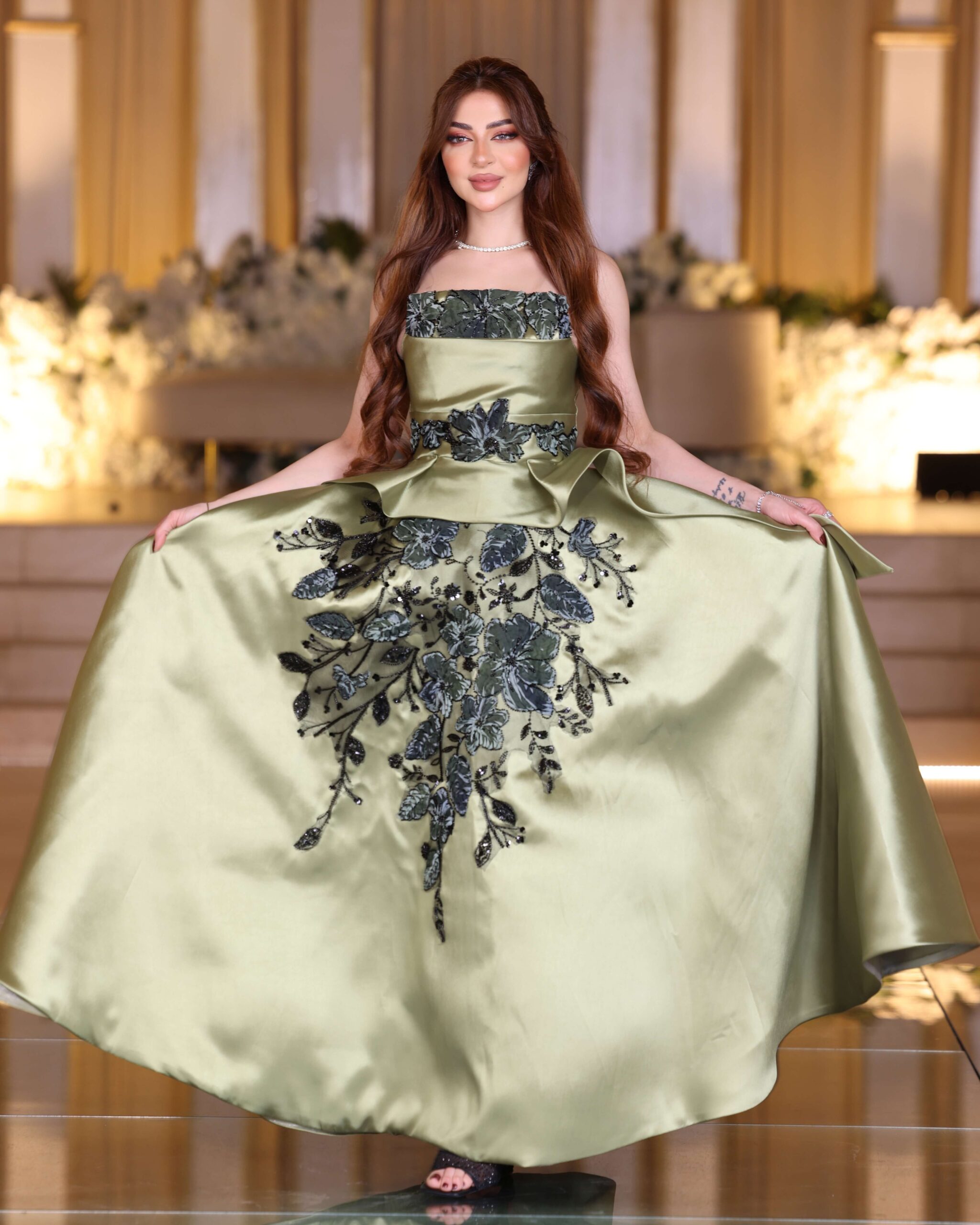 green mikado embroidered dress – strapless evening gown – evening gown Saudi – khaliji royal style