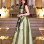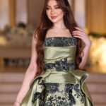 فستان ملكي آسر بلون زيتي فاخر وقماش ميكادو يضفي فخامة وأناقة لافتة. يتميز بتصميم بدون أكمام وصدر مستقيم مزين بتطريز بارز بلون داكن بنقوش نباتية أنيقة. يمتد التطريز أيضًا على الخصر والتنورة بشكل متناسق، ليمنح الفستان لمسة فنية فخمة. القصة الواسعة تمنحه حضورًا دراميًا مثاليًا للمناسبات الراقية، مع تفاصيل الطيات الجانبية التي تعزز جمالية القوام.