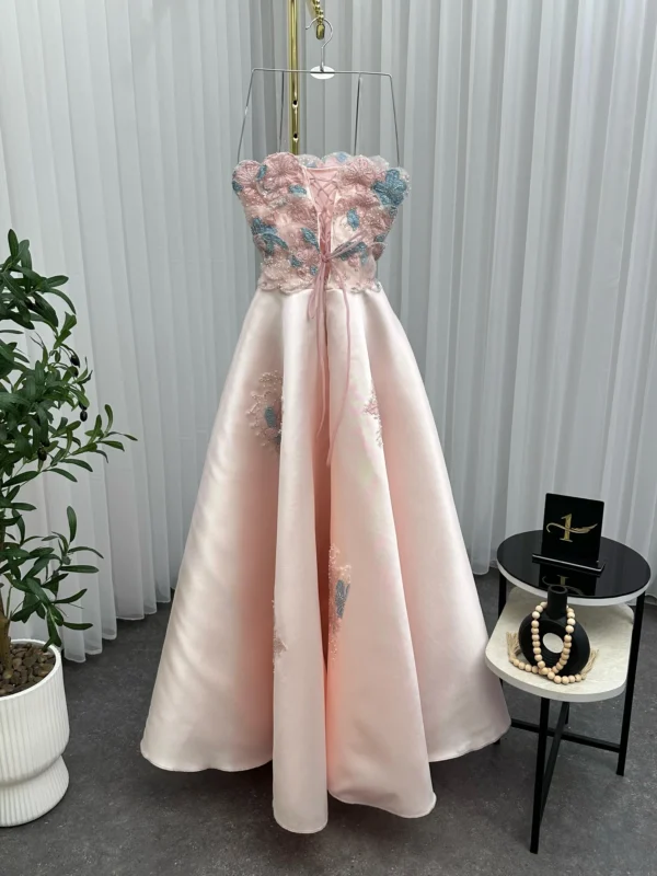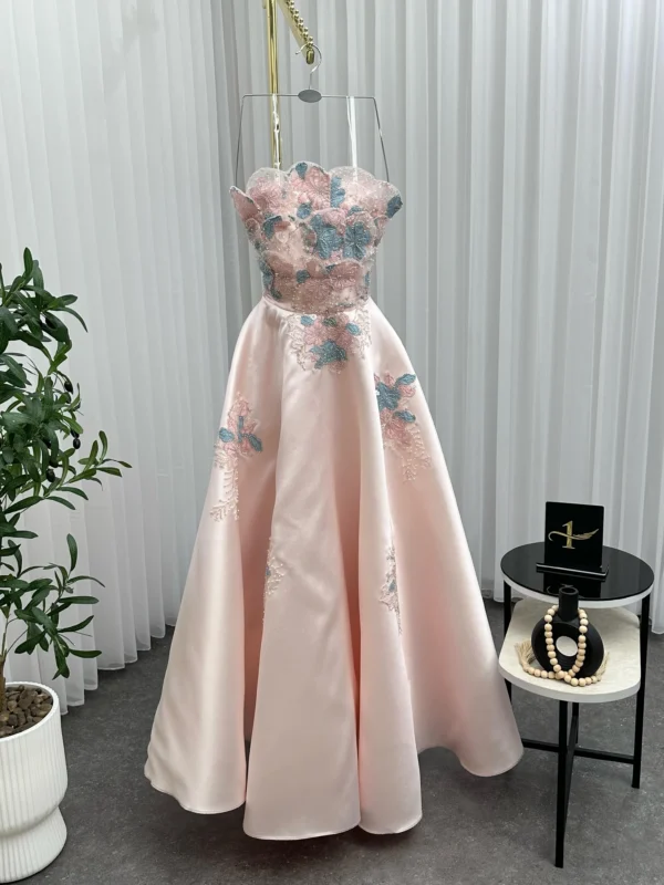 فستان سهرة طويل ميكادو مطرز بورود وردية وزرقاء