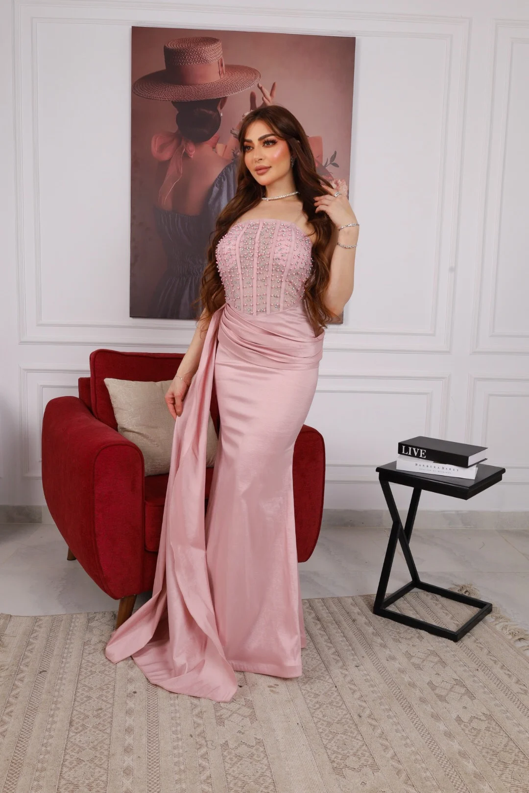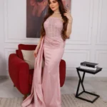 فستان سهرة طويل بلون وردي هادئ، مصنوع من قماش الشانطون الفاخر بلمعة خفيفة تزيده أنوثة. يتميز بقصّة ضيقة تبرز الخصر مع تنورة لافة تنسدل بانسيابية راقية حتى الأرض. الجزء العلوي بدون أكمام، ومصمم بقصة كورسيه ناعمة مع تطريز يدوي دقيق من حبّات اللؤلؤ الوردية والبيضاء اللامعة، تتوزع بشكل طولي أنيق يعزّز من تناسق القوام. قطعة مثالية لعاشقات التصاميم الأنثوية الفاخرة.