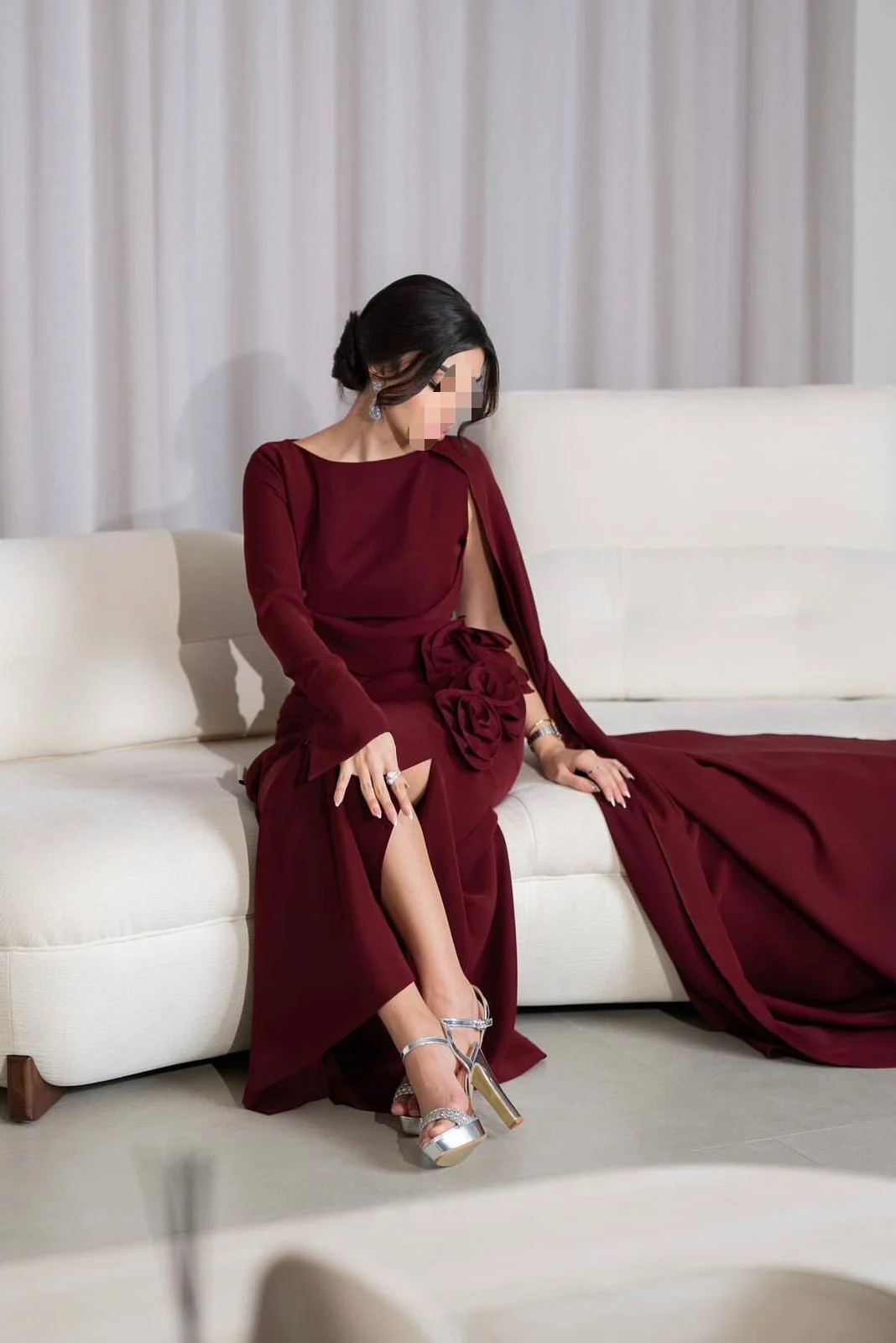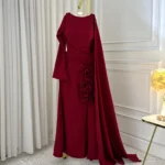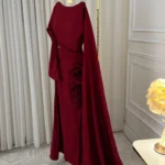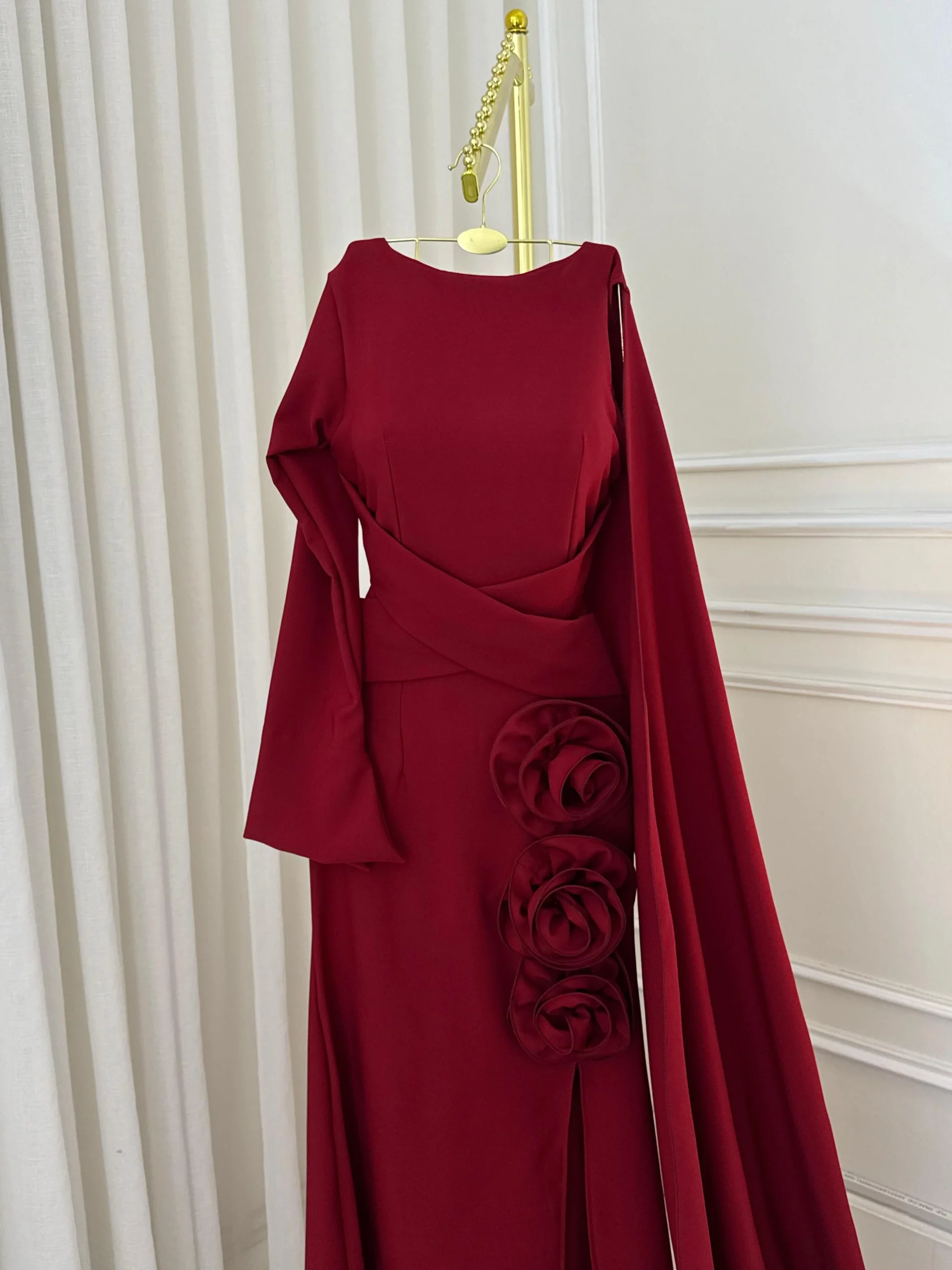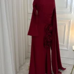 يتألق هذا الفستان باللون العنابي الغني بتصميم يجمع بين الفخامة والجرأة، حيث تأتي الصدرية بتصميم منحوت بلا أكمام لتعكس الأنوثة بأسلوب راقٍ، بينما يزينها وردة قماشية ضخمة على الخصر تضيف بعدًا دراميًا ساحرًا. أما التنورة الطويلة المنسدلة، فهي تمنحك حركة سلسة وانسيابية ملكية، مما يجعل الفستان خيارًا مثاليًا للسهرات والمناسبات الخاصة.