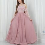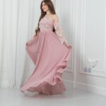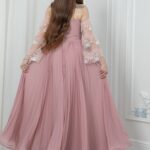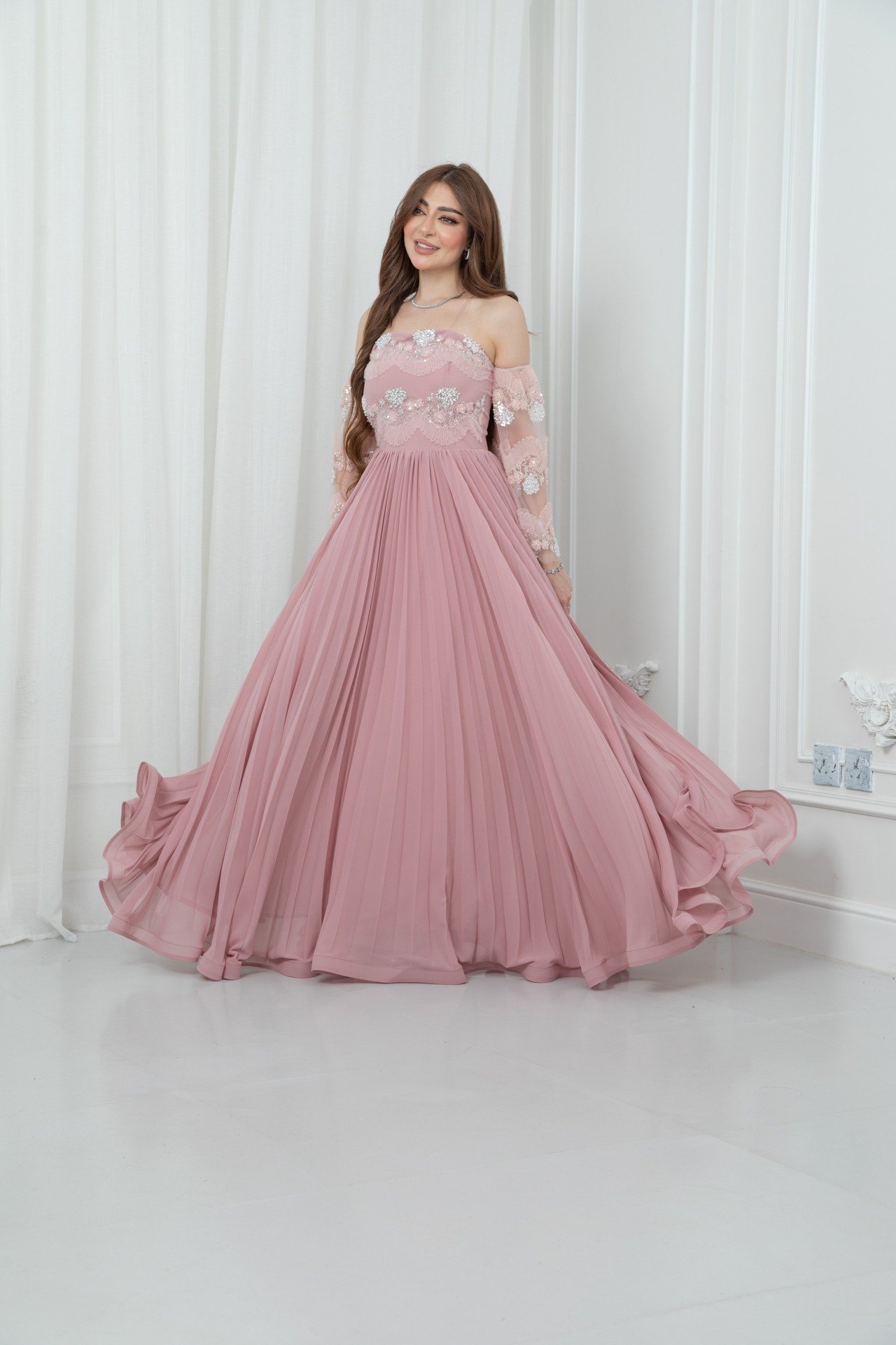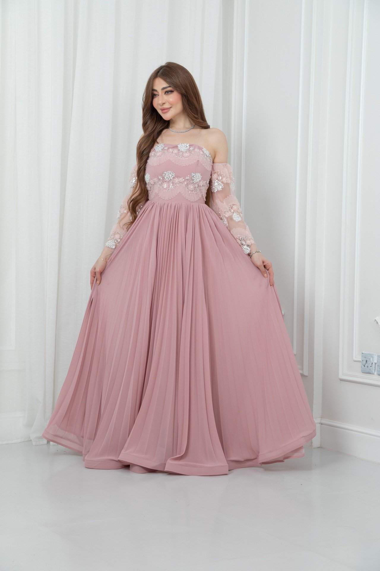 فستان وردي فاتح بتصميم انسيابي يعكس الأنوثة والرقة في كل تفصيل. يتميز بصدر مطرز يدويًا بتفاصيل فضية ناعمة تبرز جمال الجزء العلوي بأناقة لافتة، بينما تأتي الأكمام الشفافة المنسدلة مزينة بورود مطرزة تمنح طابعًا رومانسيًا راقيًا. تنورة الفستان بقصة بليسيه واسعة تبدأ من الخصر وتنسدل بسلاسة، مما يضفي مظهرًا ملكيًا فاخرًا مثاليًا للمناسبات المميزة.